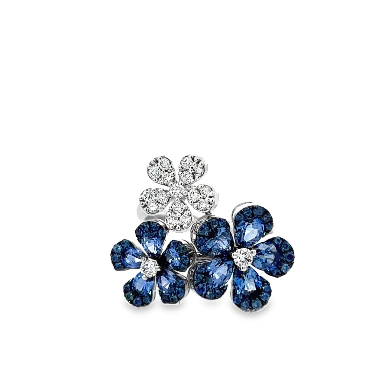 This flower fashion ring is made of 18kt white gold, with a gorgeous triple flower top. Ceylon blue sapphires create a stunning visual, creating two flower shapes. The third flower made of gorgeous pave set diamonds. The ring features 0.44ct of round white diamonds and 3.24ct of Sapphires.
