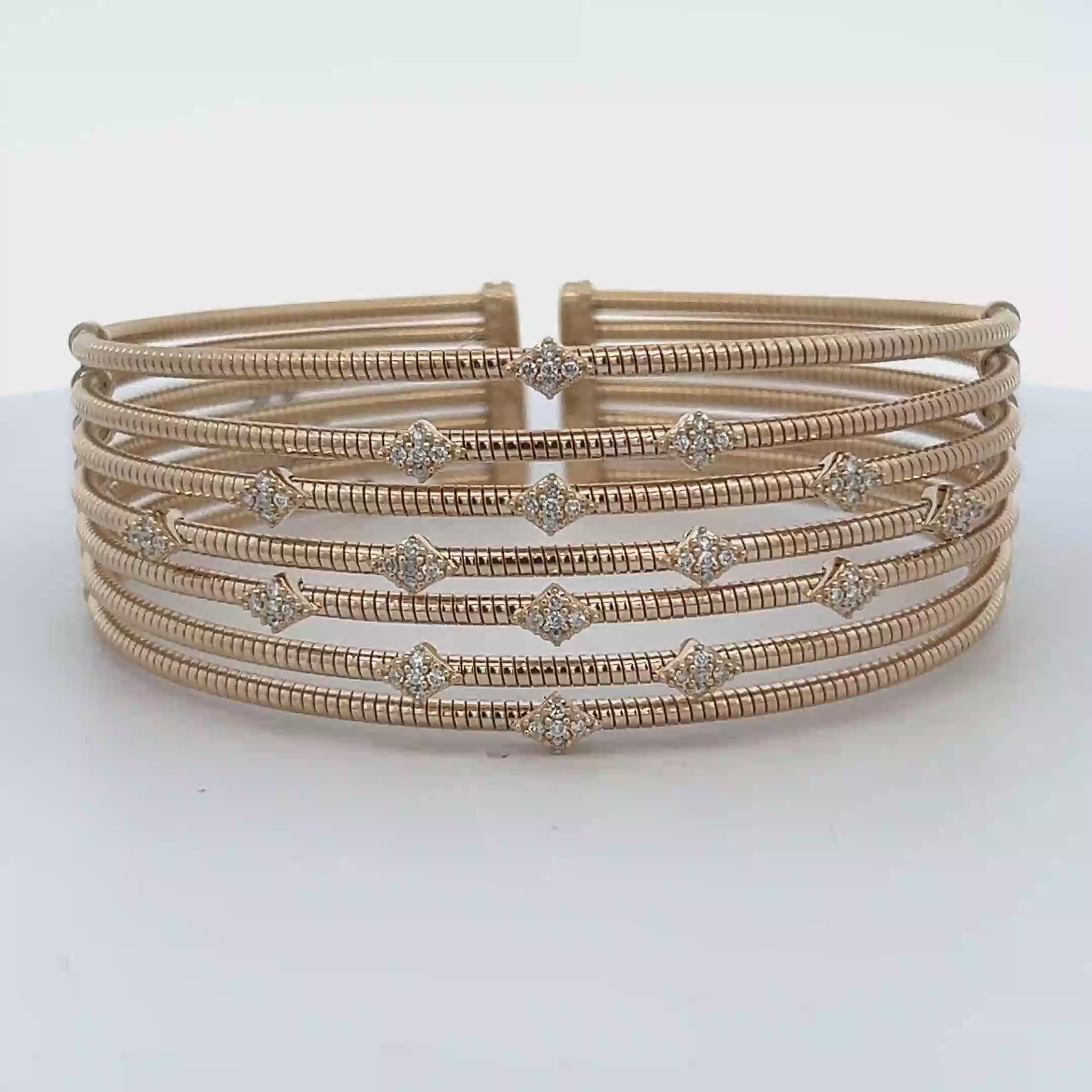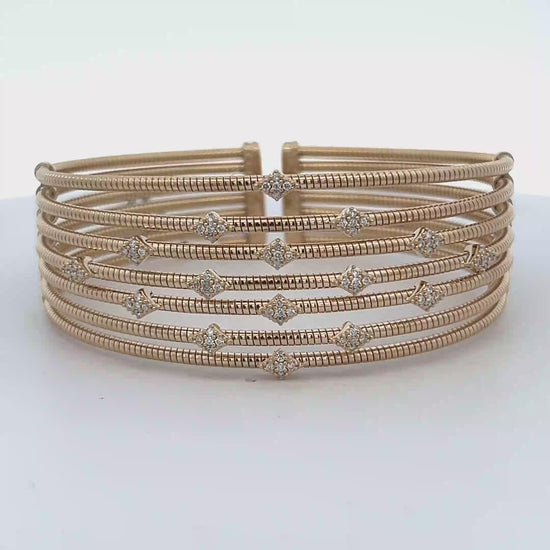 Elevate your ensemble with this luxurious rose gold bangle bracelet. Crafted from lustrous gold, this multi-strand bangle features exquisite diamond accents set in a floral design, adding a touch of subtle sparkle. The open design ensures a comfortable fit, making it a stylish addition to any jewelry collection.
