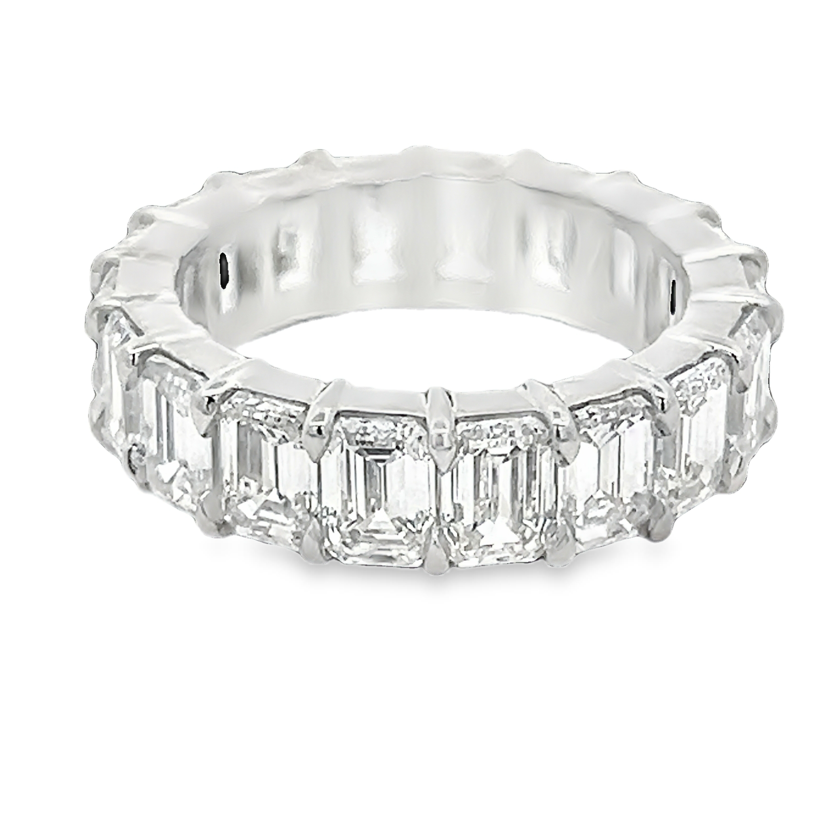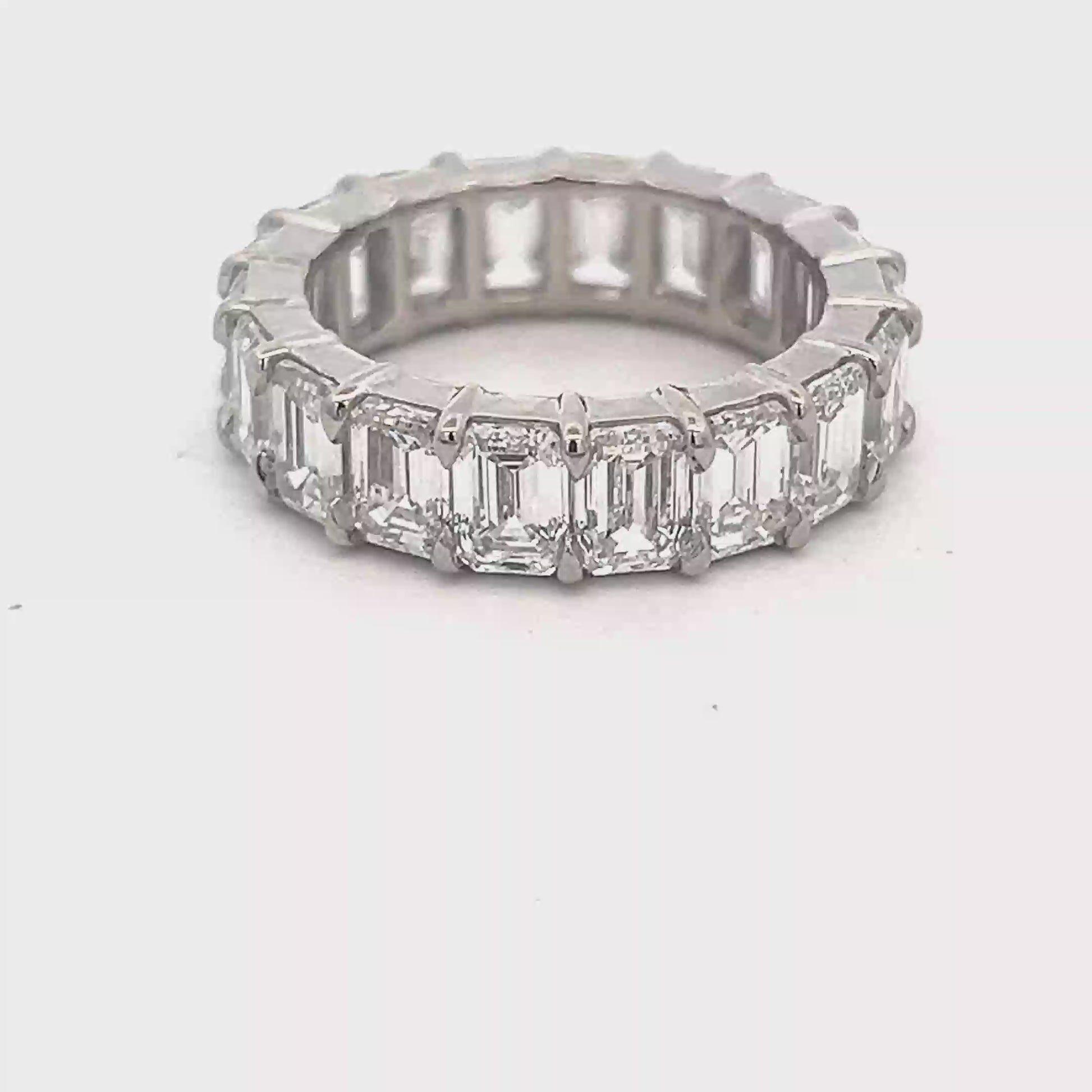 Exquisite platinum eternity ring featuring a continuous row of brilliant-cut emerald shape diamonds. This ring showcases exceptional craftsmanship and offers a timeless elegance, with each diamond meticulously set to maximize brilliance. Its sleek, sophisticated design makes it a perfect symbol of enduring love and commitment. The ring's seamless construction ensures comfort and style for everyday wear.