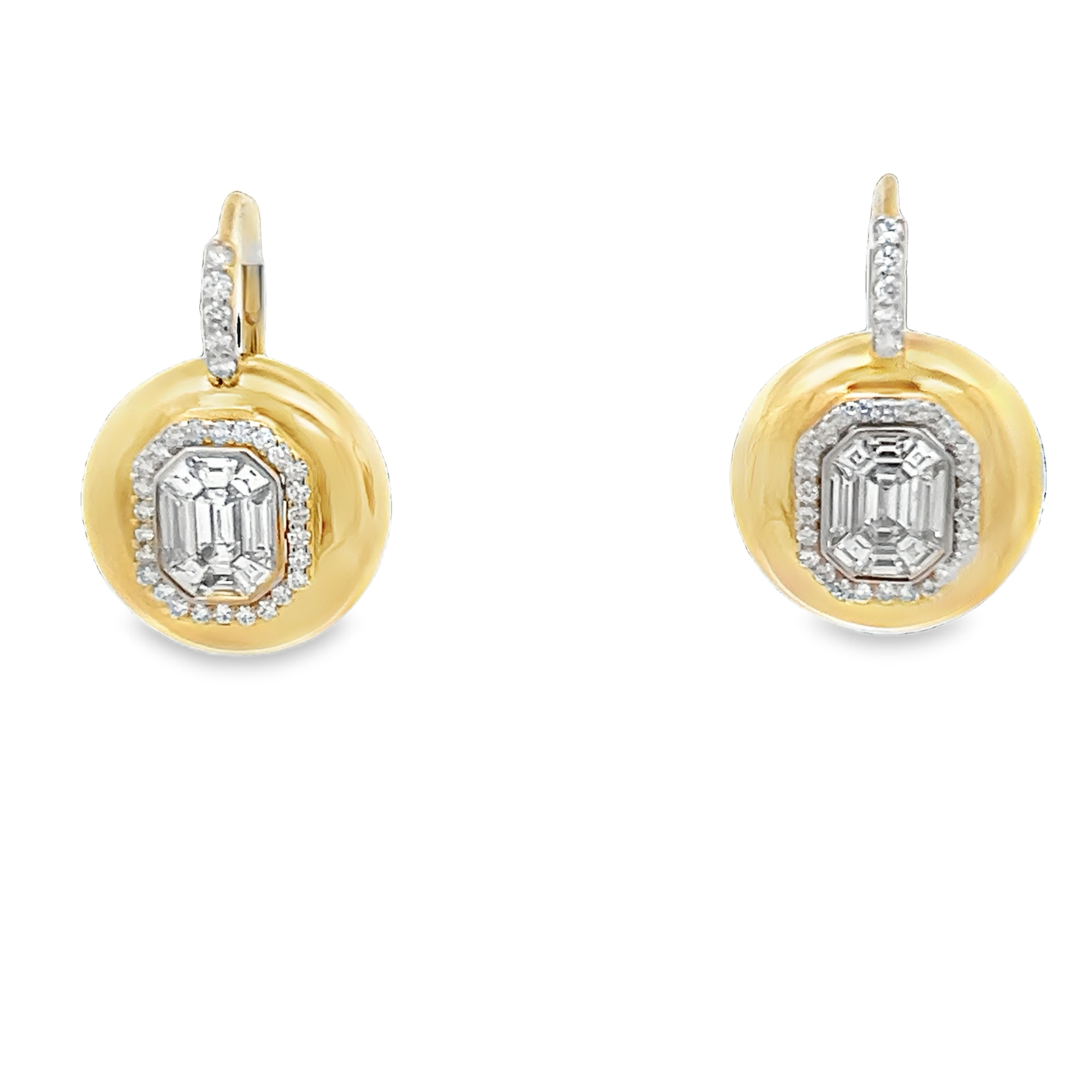 Discover the perfect blend of elegance and sophistication with these stunning gold and diamond earrings. Featuring a unique design, each earring showcases a brilliant emerald-cut diamond surrounded by a halo of sparkling smaller diamonds, set in a luxurious gold base. Ideal for both special occasions and everyday wear, these earrings will elevate any outfit.