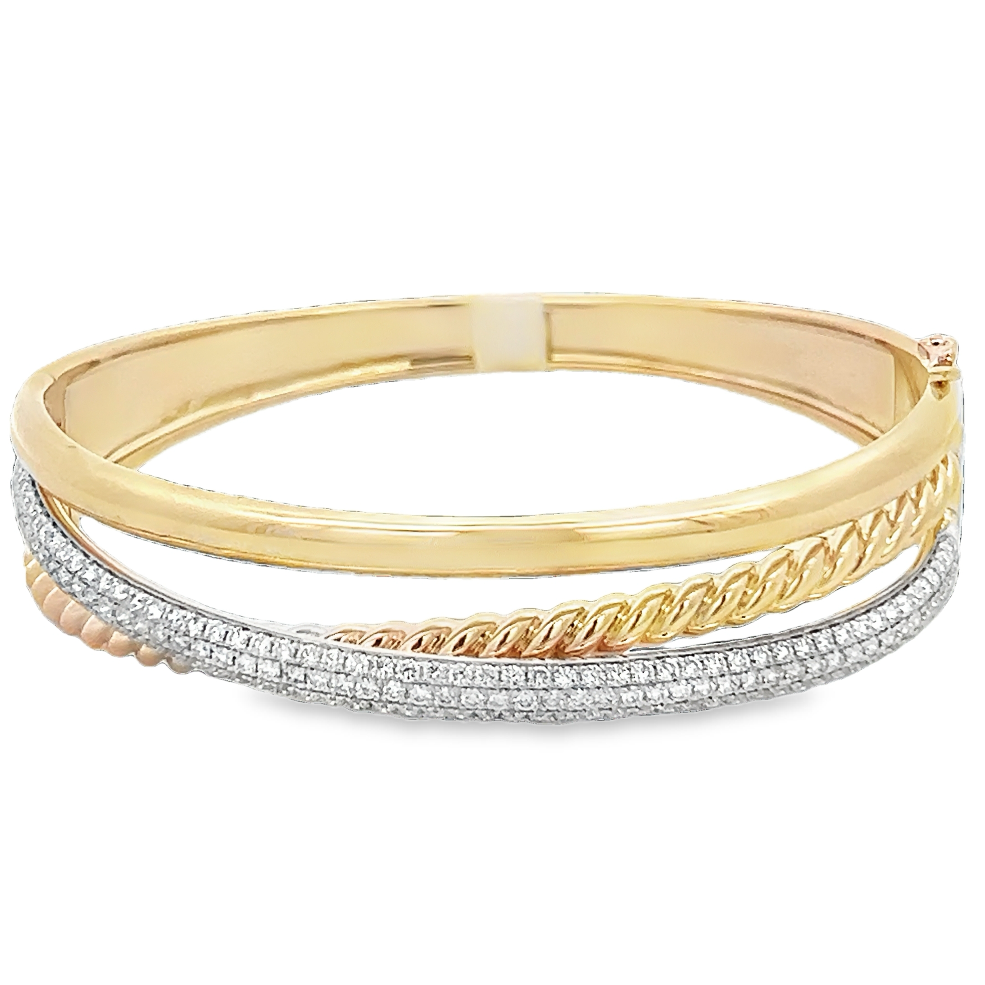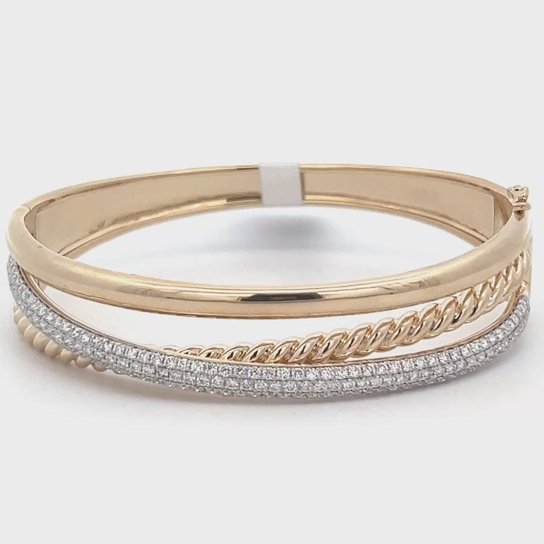 Lady's Yellow 14 Karat 3 Row Crossover Bangle Bracelet With 163=1.85Tw Round Diamonds (26.1gr)