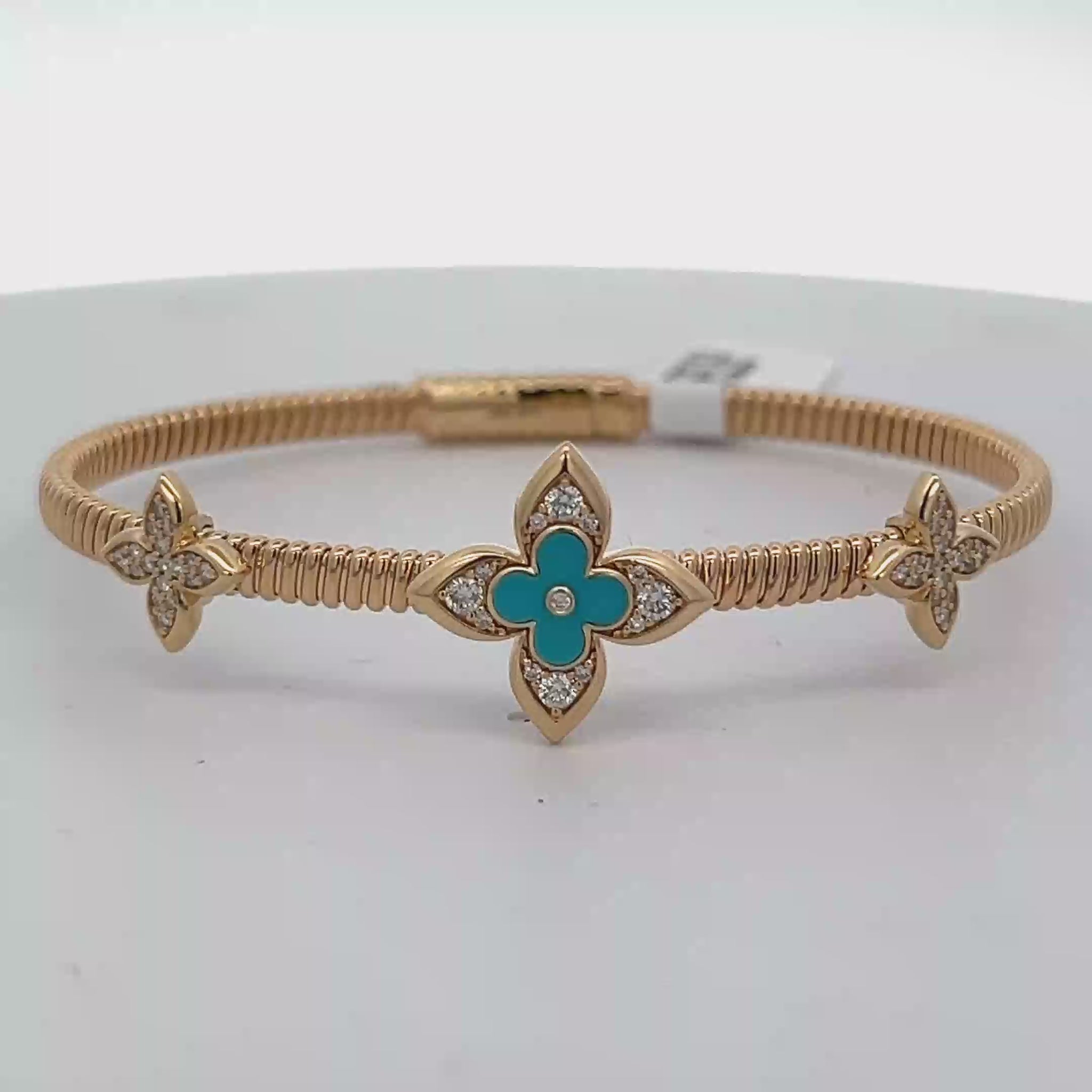 Exquisite rose gold bangle bracelet featuring a captivating turquoise gemstone in a round cabochon cut. This stylish bracelet embodies a harmonious blend of sophistication and vibrant color, creating a distinctive jewelry piece suitable for everyday elegance and special occasions. The bracelet's design showcases exceptional craftsmanship and an eye-catching appeal.