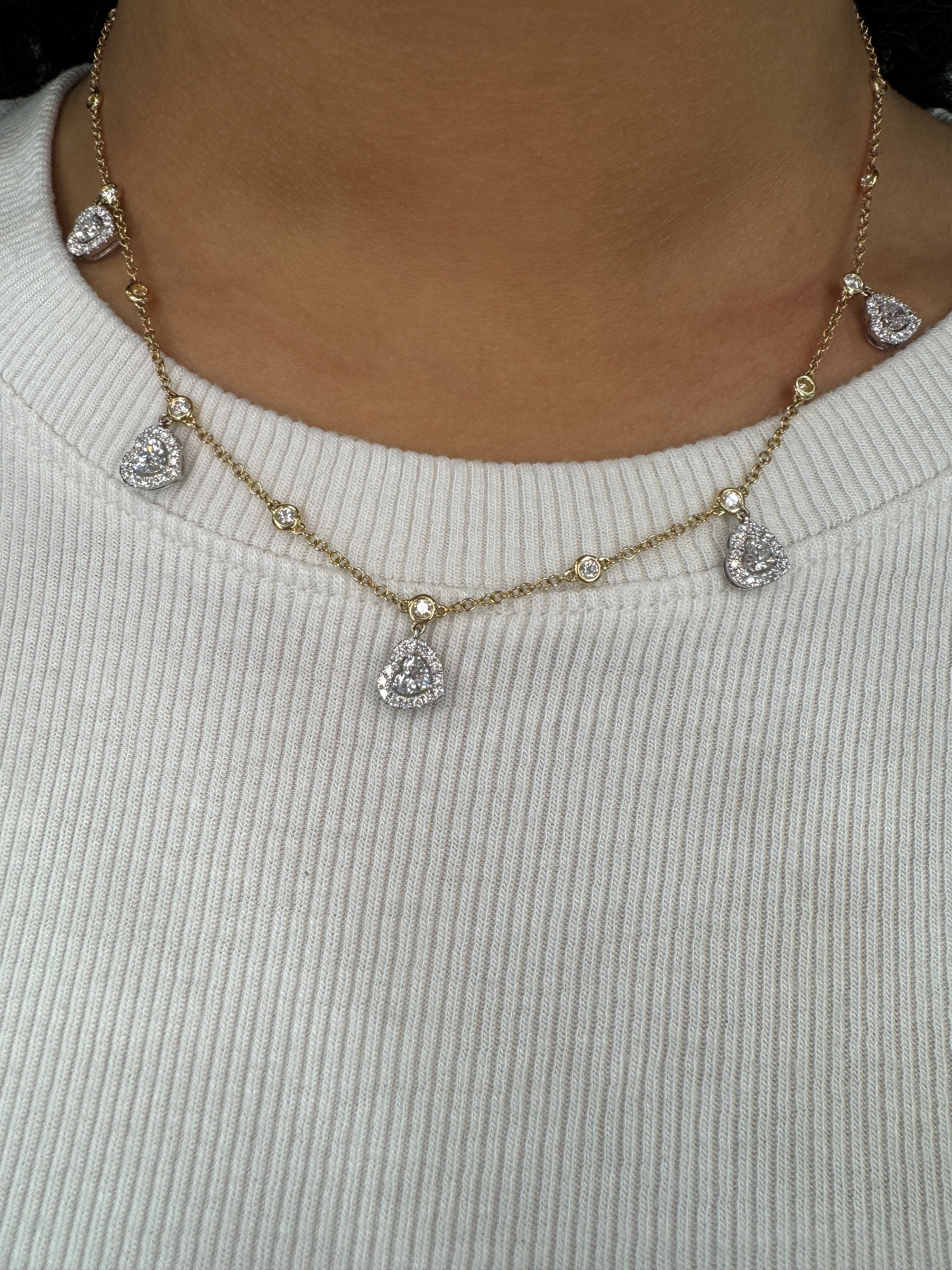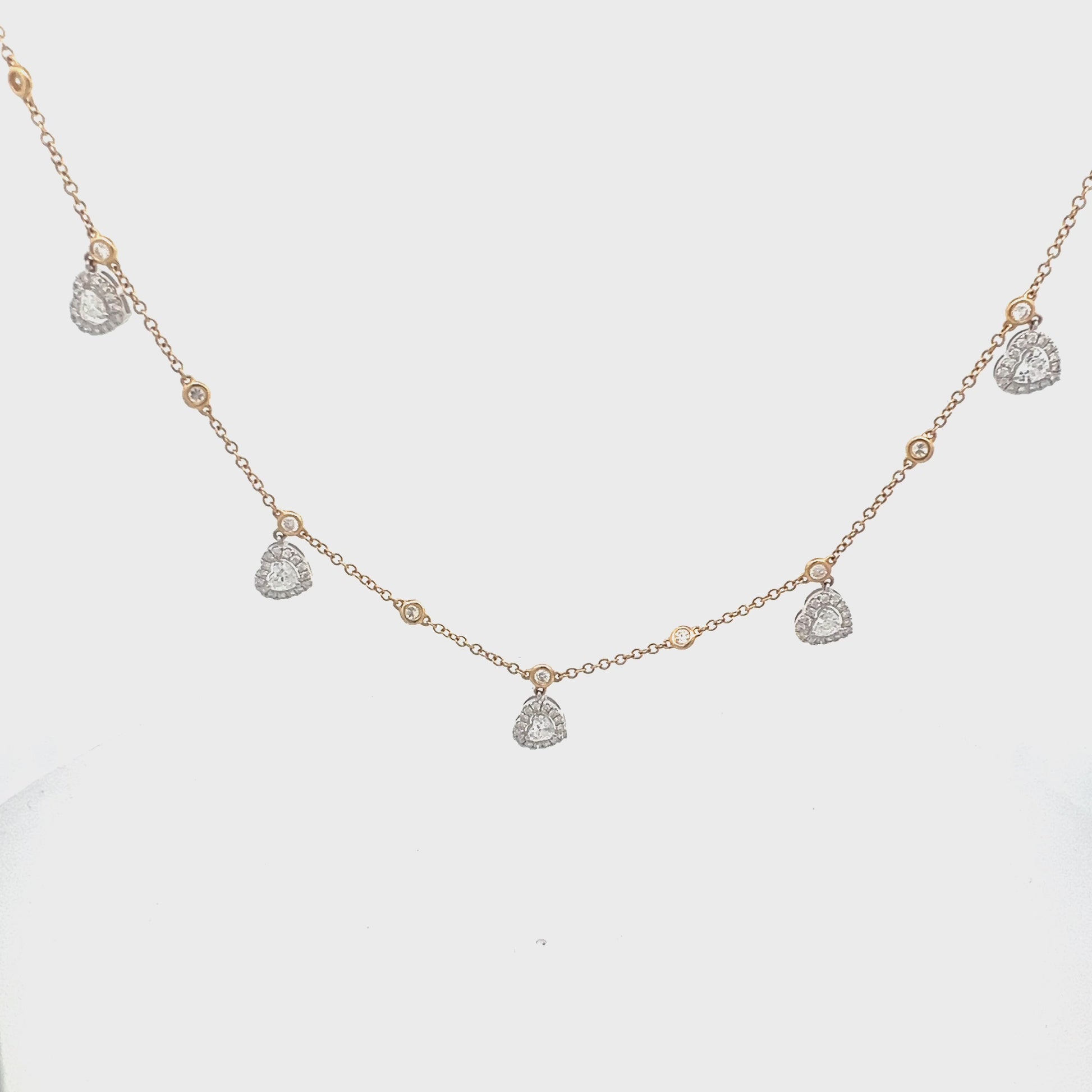 White and Yellow Gold 18 Karat Diamonds By The Yard with 5 Heart Drops Necklace with 5 Heart Diamonds and 88 Round Diamonds