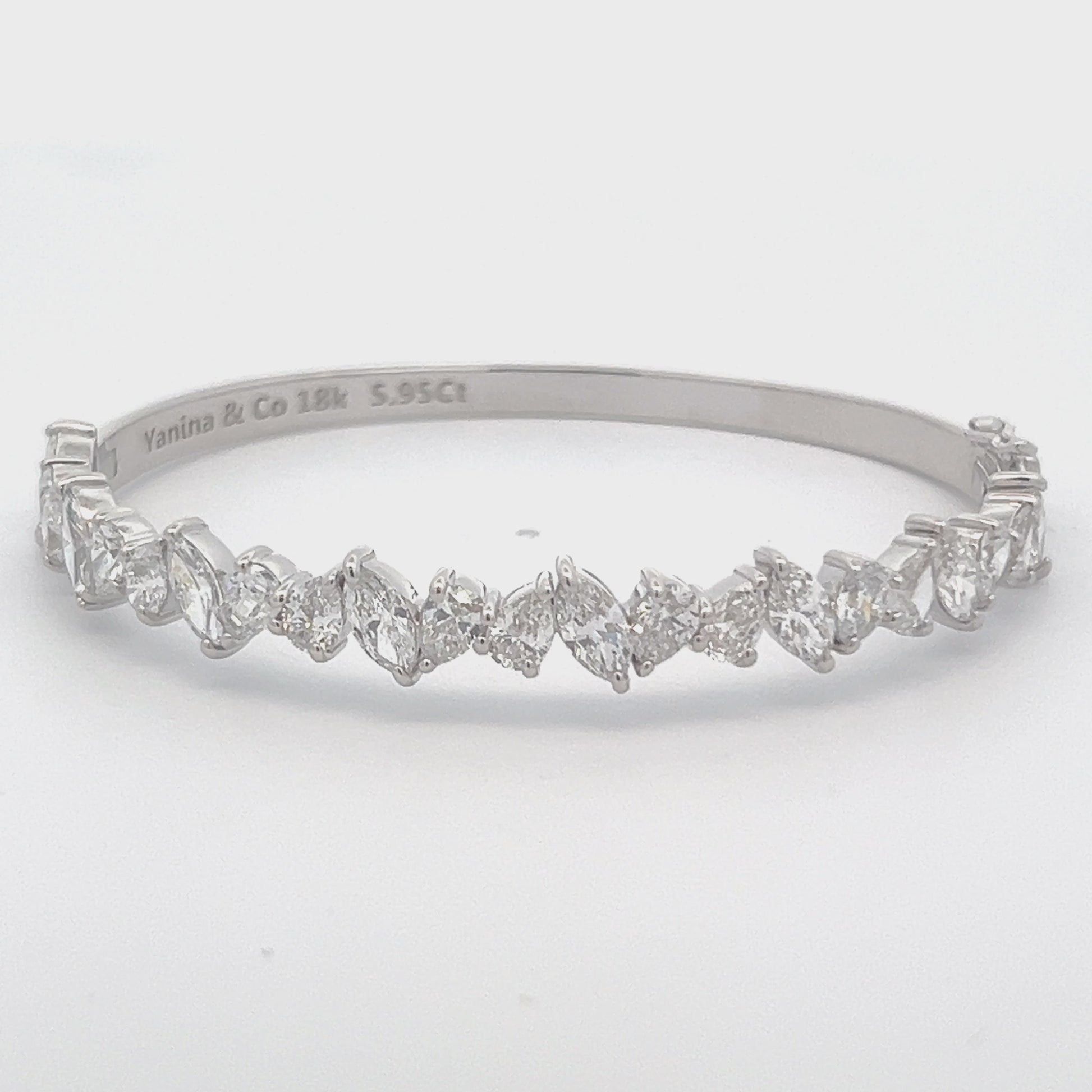White Gold 18 Karat Lab Diamond Top Bangle Bracelet with 14 (3.37Tw) Pear E/F Vvs2 Diamonds and 8 (2.58Tw) Marquise E/F Vvs Diamonds