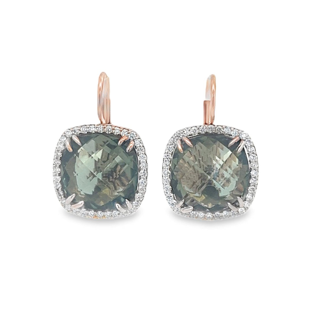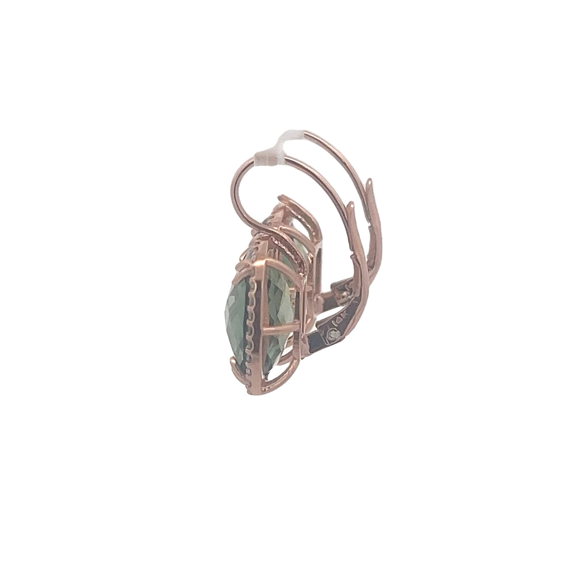 Lady's Rosé 14 Karat green amethyst diamond Halo On Eurowire Earrings With 2=13.00Tw Cushion Amethysts And 72=0.52Tw Round Diamonds(6.7gr)