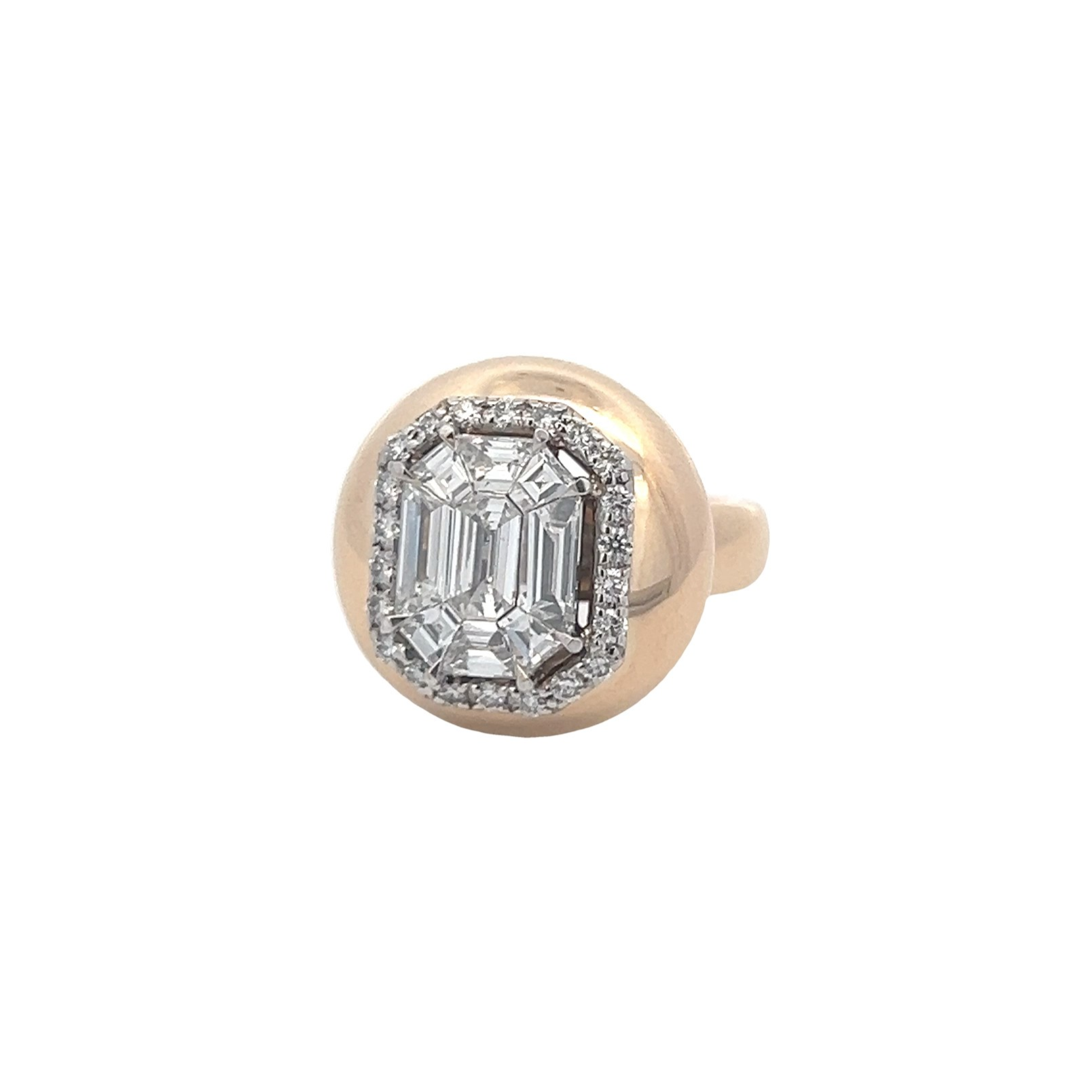 This exquisite ring features a lustrous gold band that is beautifully adorned with an array of sparkling diamonds. The intricate design centers around a dazzling, rectangular-cut diamond, making it a perfect statement piece for any special occasion.