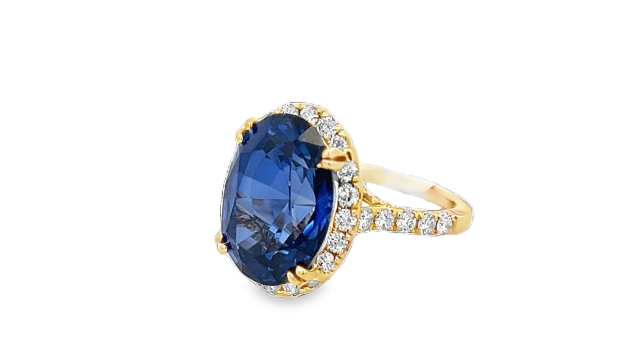 Lady's yellow 18 Karat Halo Fashion Ring With 94=1.42Tw Round Diamonds And One 12.75Ct Ova Compound Sapphire (7.2gr)