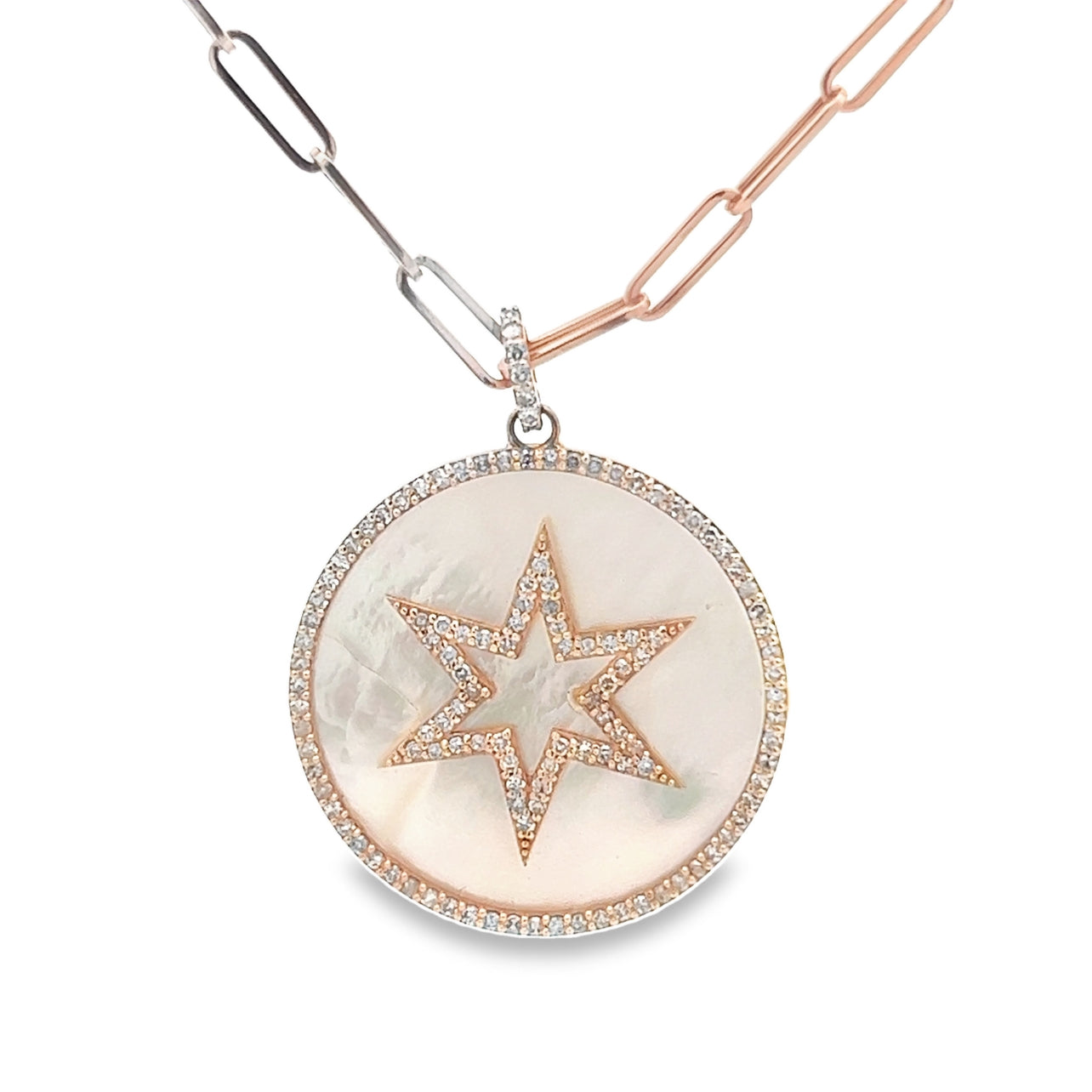 Rose Gold 14 Karat Paperclip Chain with diamond mother of pearl star discĀ