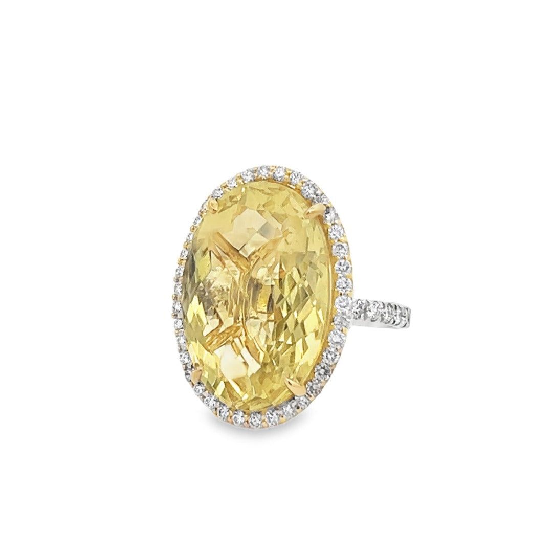Lady's Yellow 18kt and Platinum Fashion Ring one 26.76ct Oval Citrine 38=0.76tw Round Diamonds 29=1.20tw Round Diamonds (13.4gr)