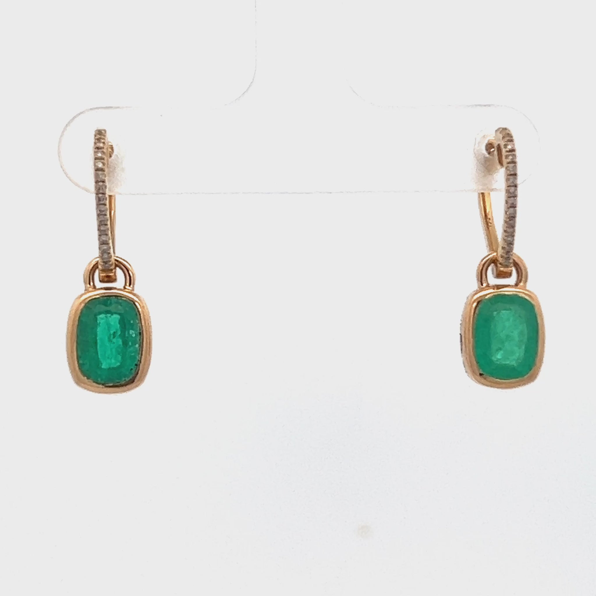 Exquisite rose gold drop earrings featuring vibrant green emerald gemstones in an elegant cushion cabochon cut. These sophisticated pieces showcase high transparency and smooth polish, highlighting the natural allure of the gemstones. The sleek metalwork complements the soft curves of the cushion shape, creating a harmonious and luxurious arrangement. Perfect for high-end fashion, these earrings offer a timeless aesthetic with a modern touch of warmth from the rose gold setting.