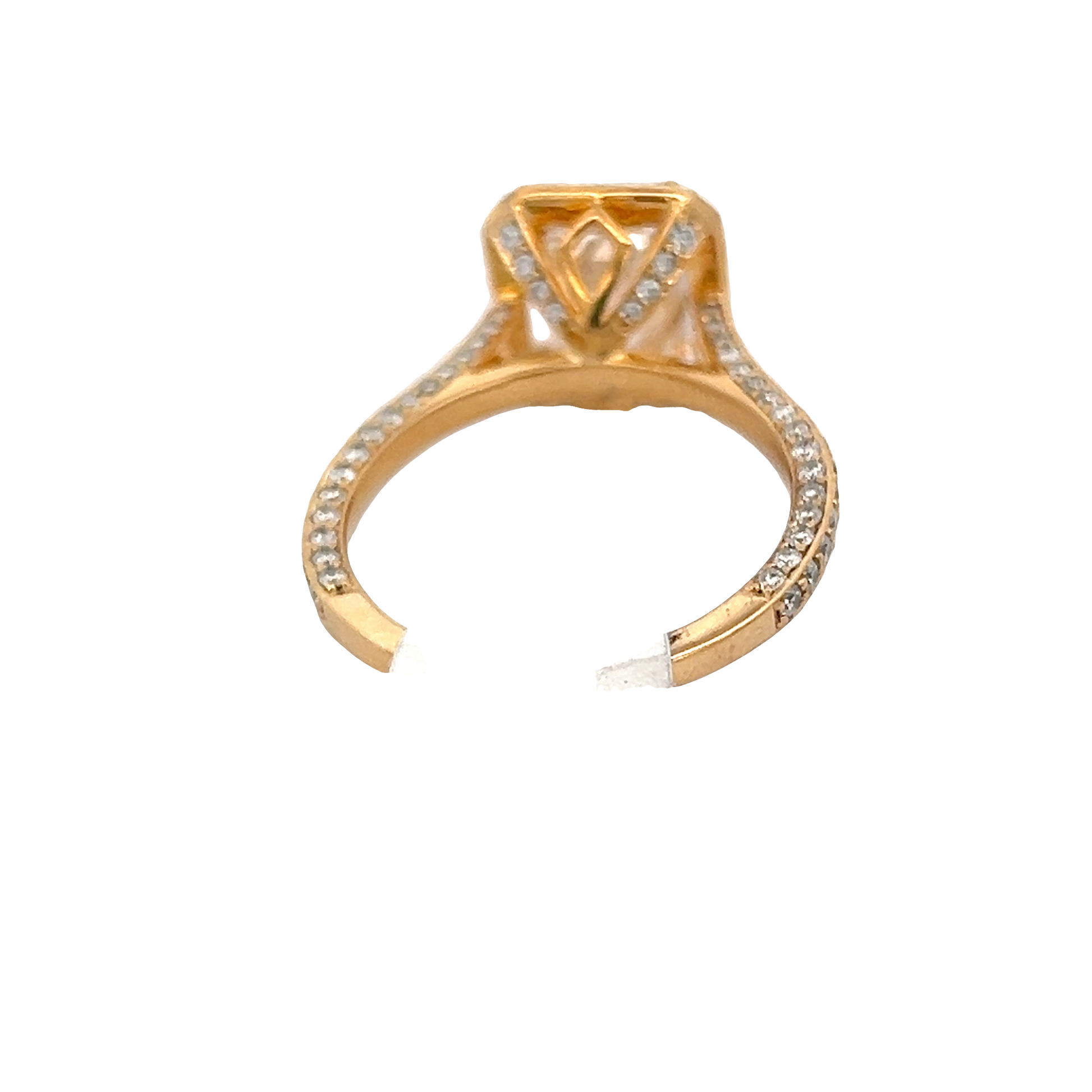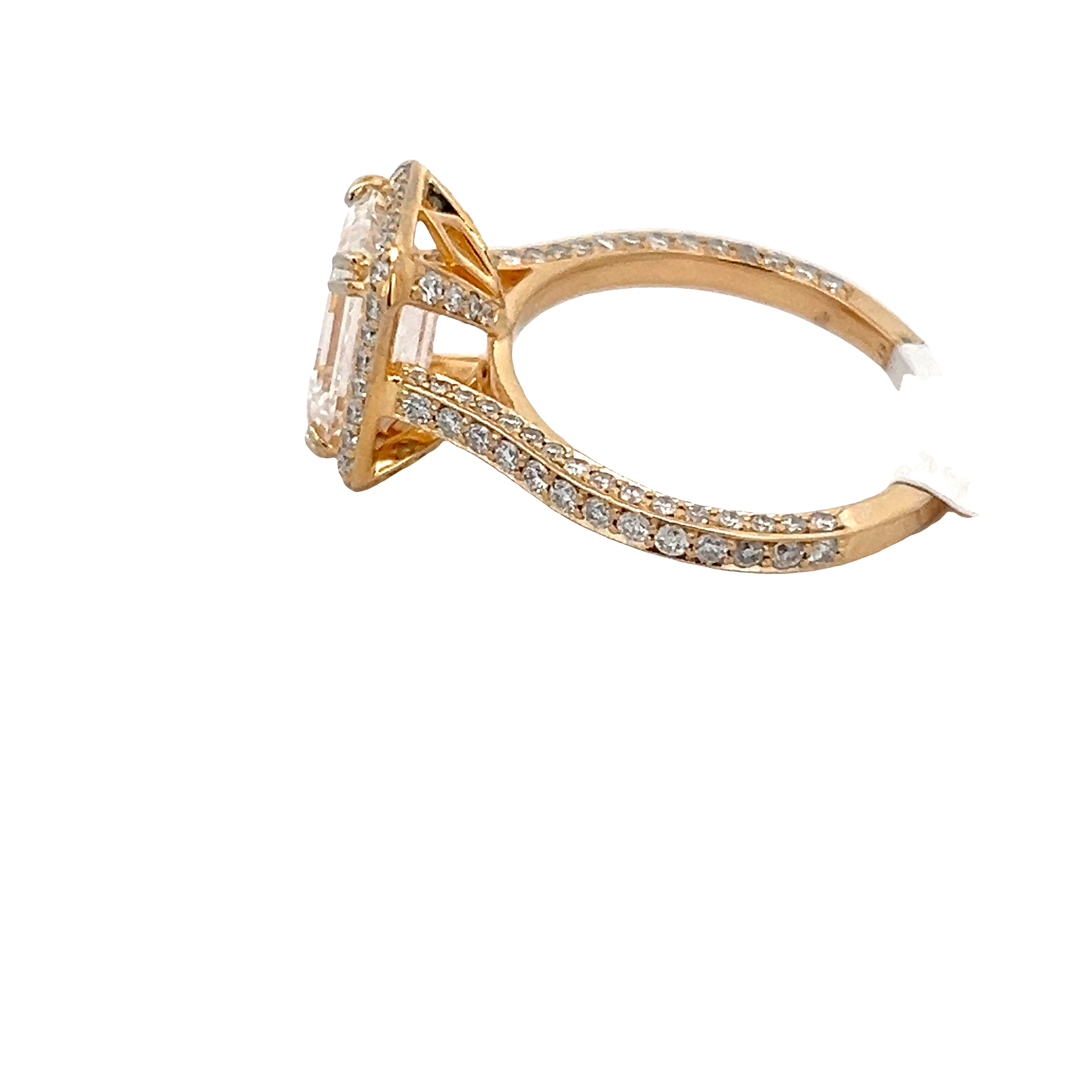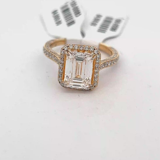 Enthralling engagement ring featuring an emerald-cut diamond, exhibiting classic step cutting that enhances its inherent beauty. The ring's design is brought to life with a rose gold setting that complements the diamond's brilliance, creating a luxurious aesthetic.