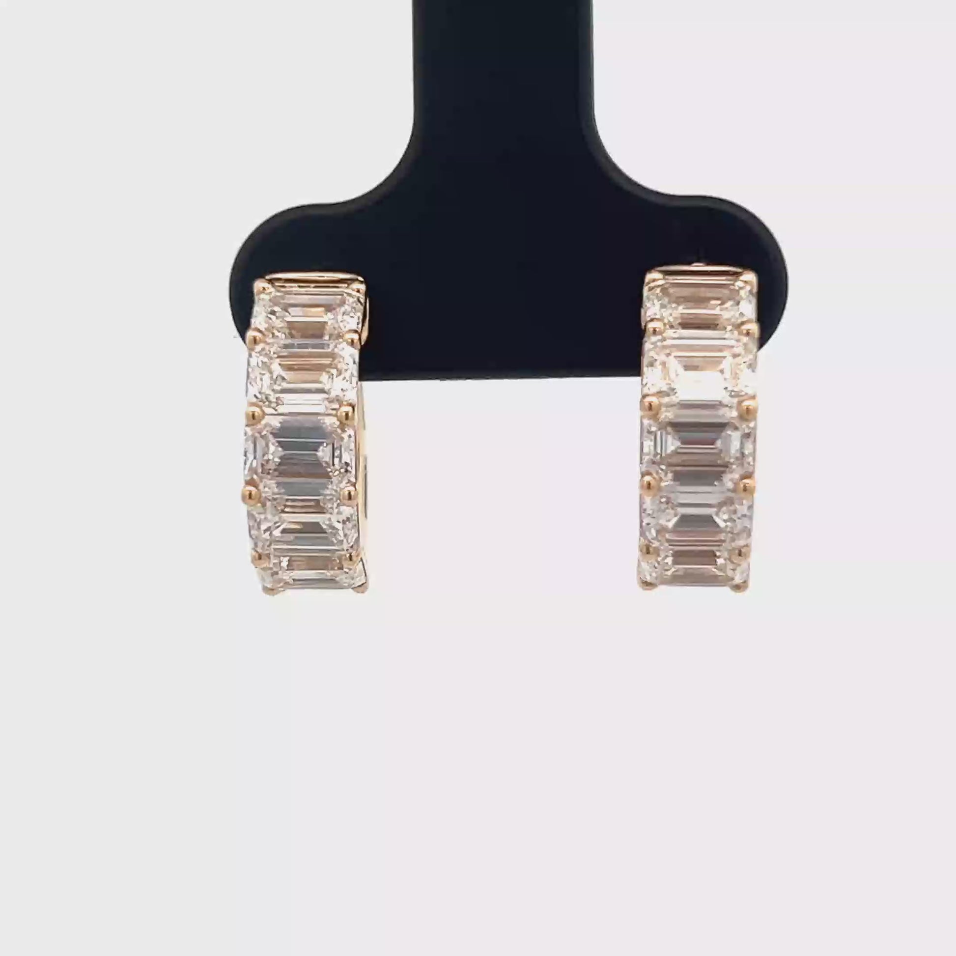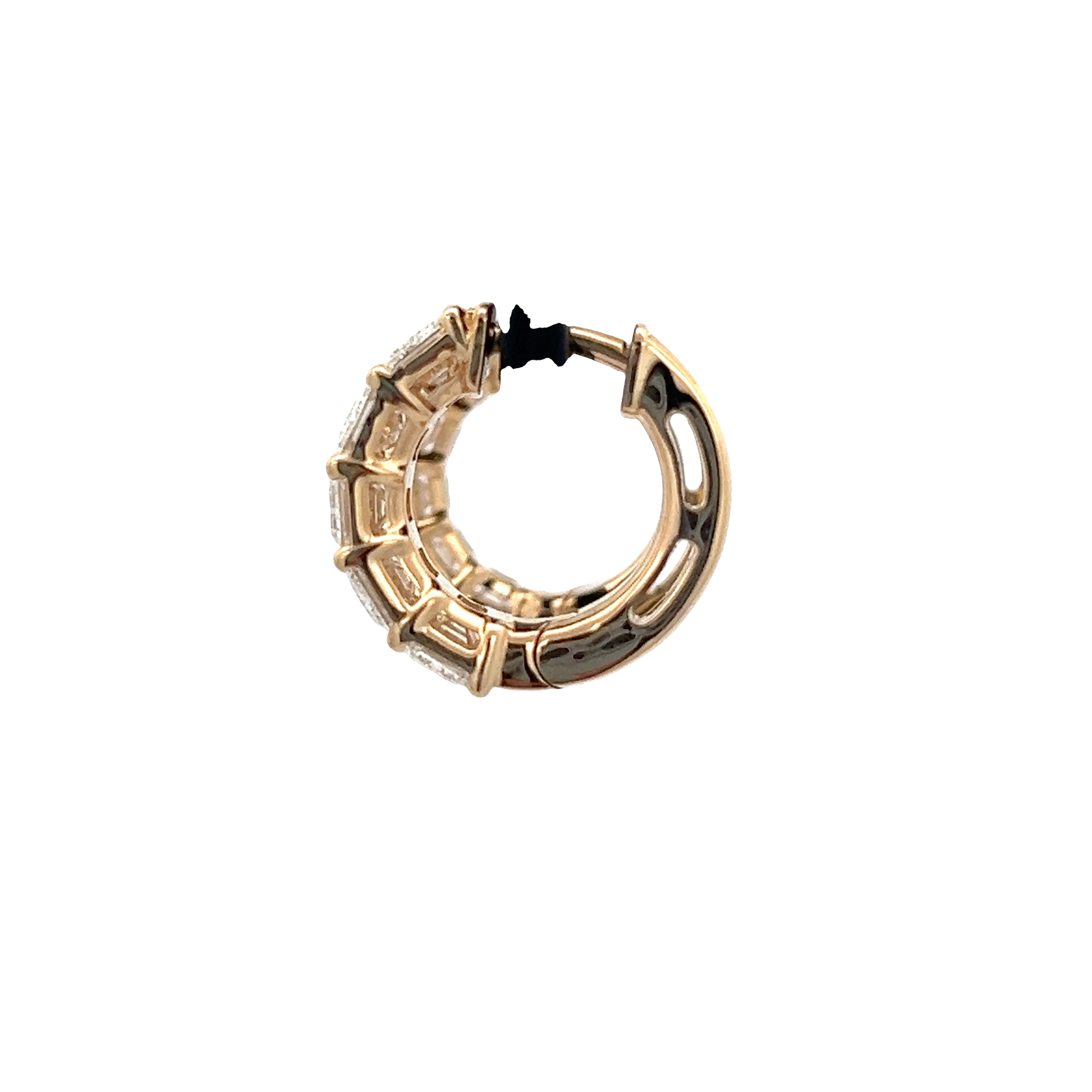 Elevate your everyday look with these radiant yellow gold hoop earrings. Each earring features a row of meticulously set, emerald-cut diamonds. The step-cut faceting enhances the diamonds' brilliance, creating a mesmerizing sparkle. The classic hoop design ensures comfortable wear, while the high-polish gold setting adds a touch of timeless elegance.