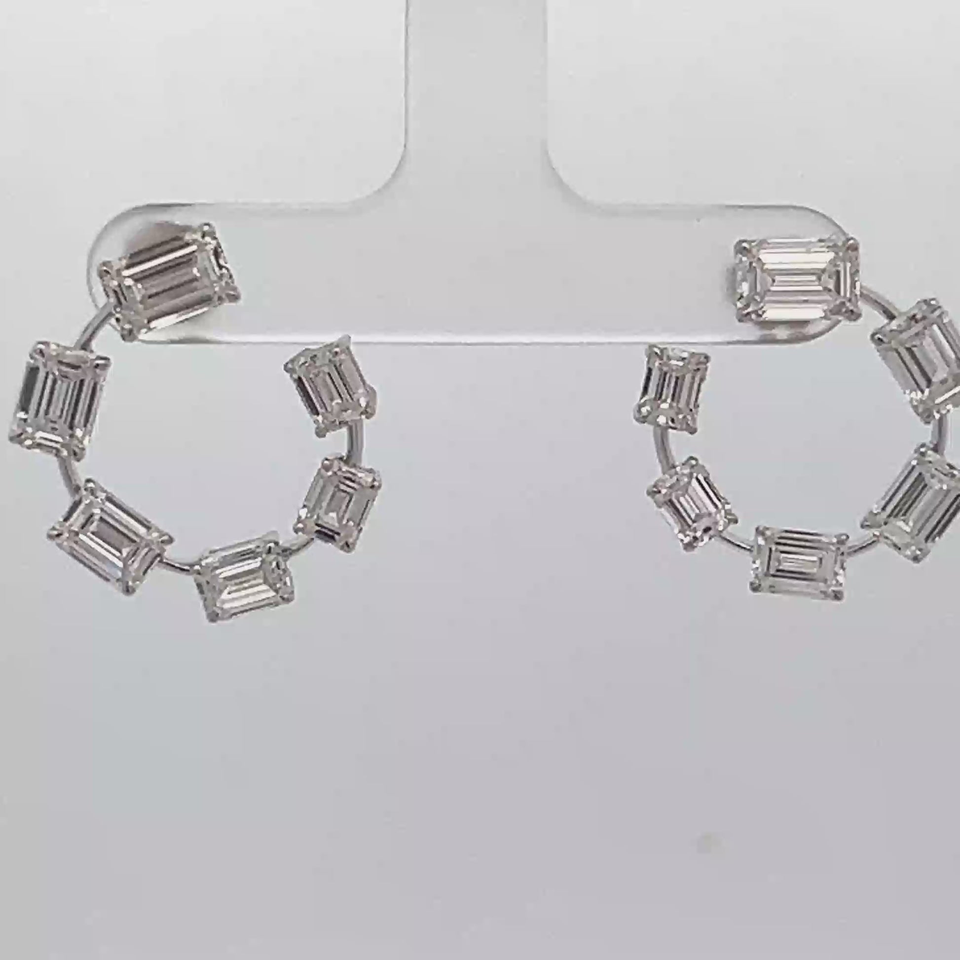 These elegant hoop earrings are meticulously crafted in polished white gold, featuring a sophisticated vertical suspension. Each earring is adorned with a stunning array of emerald-cut diamonds, arranged in a seamless channel-like setting. The step-cut facets of the diamonds offer exceptional transparency and brilliance. With a classic silhouette and modern refined lines, these high-jewelry hoops showcase superior symmetry and polish, making them a timeless addition to any luxury collection.