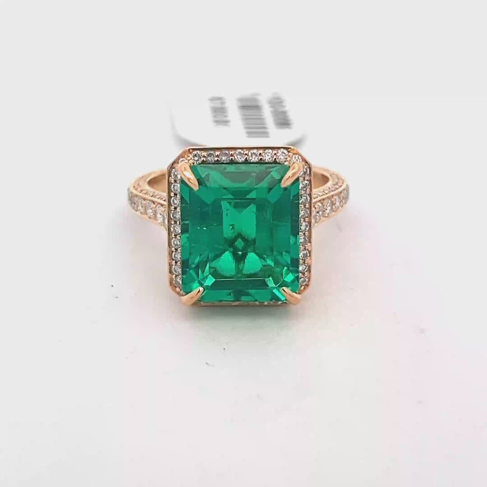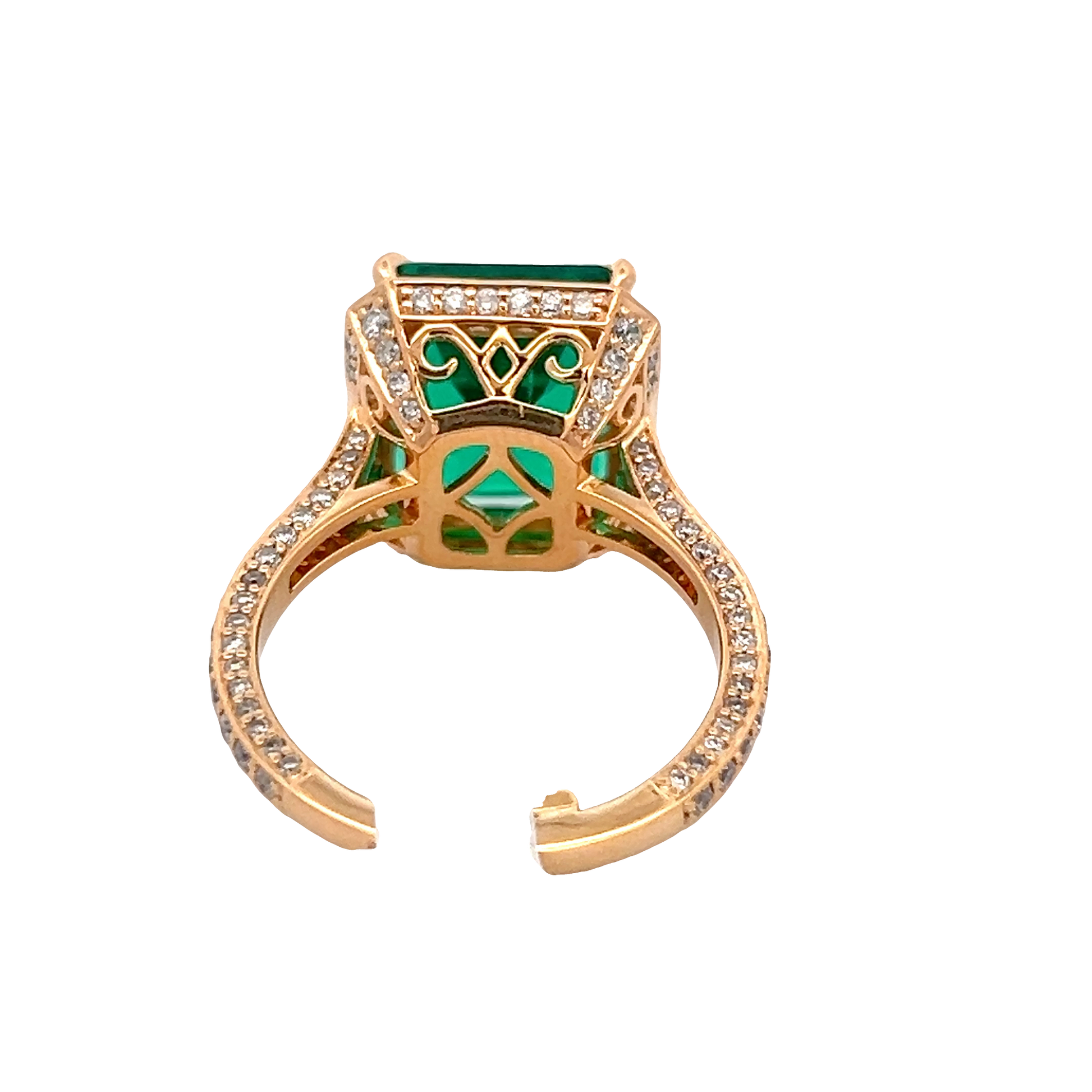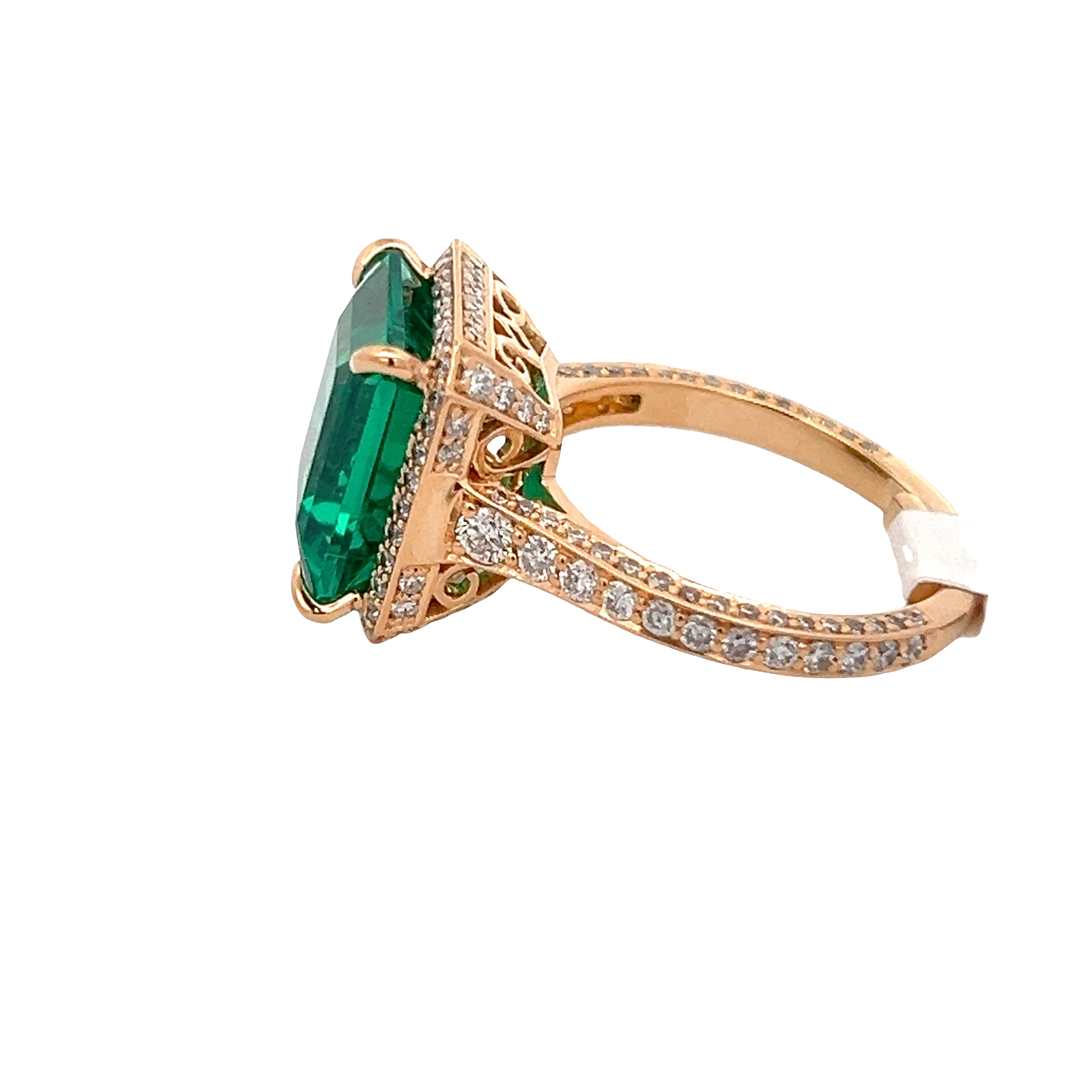 Exquisite cocktail ring featuring a mesmerizing square step-cut emerald, cradled in a luxurious rose gold setting. The rich green hue of the emerald, combined with the warm tones of the gold, creates a harmonious blend of sophistication. Ideal for making a statement, this cocktail ring exudes elegance.