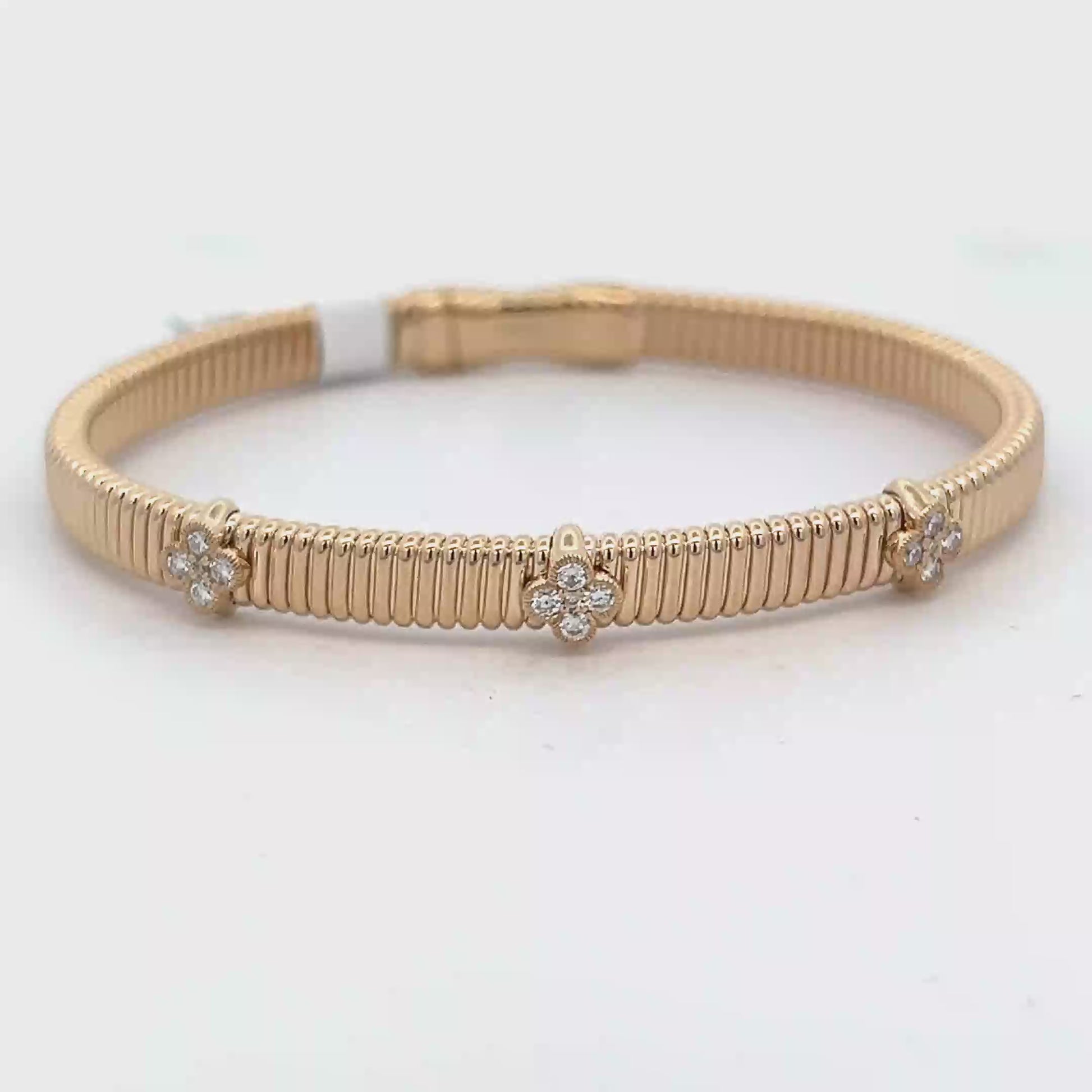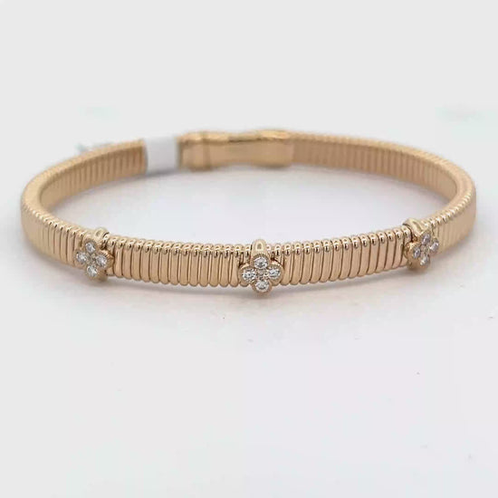 Lady's Yellow 14 Karat Gooseneck Soft Bangle Bracelet Length 7" With 3 diamond clovers 15 = 0.30Twt Round Diamonds (16.4gr)