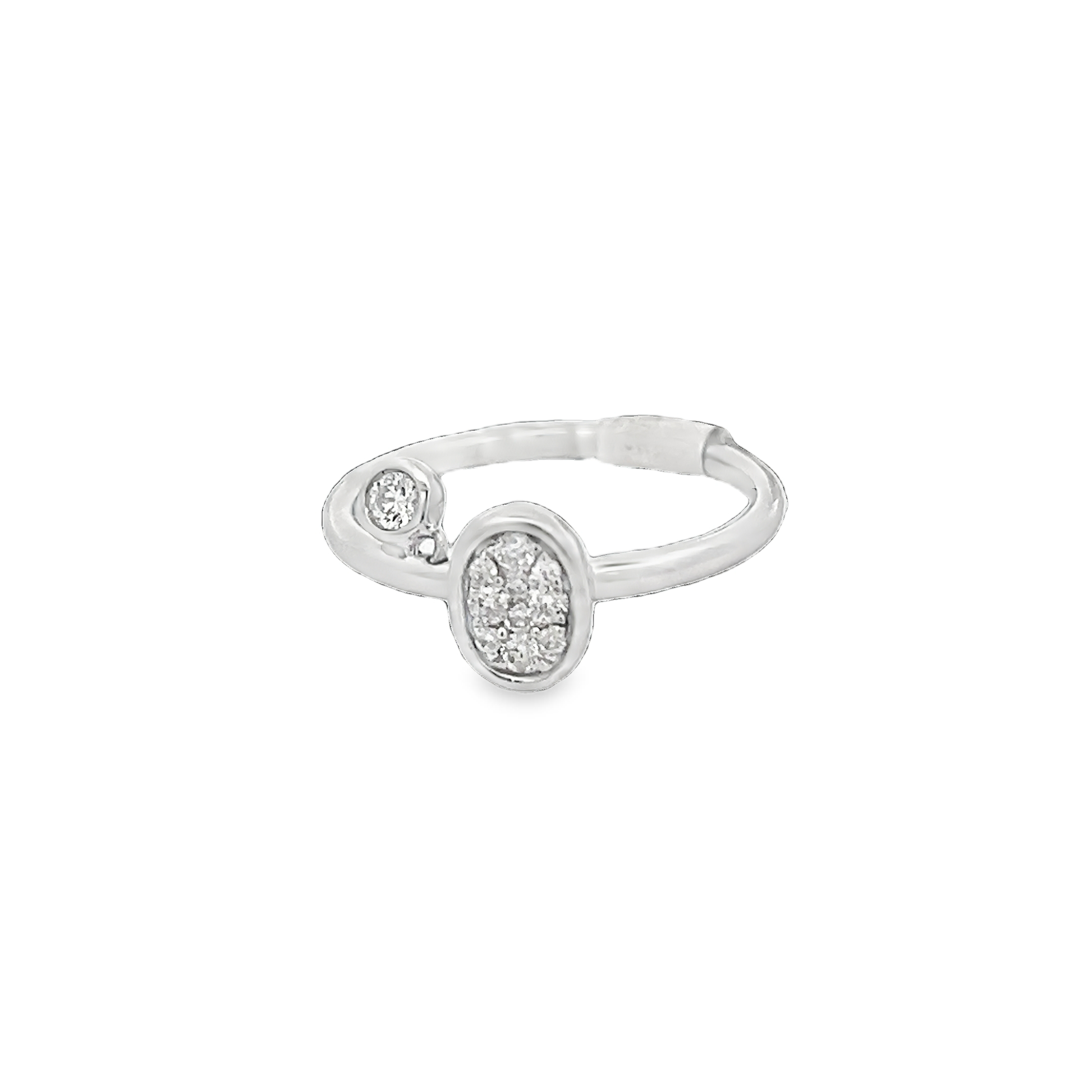 This elegant silver ring features a stunning oval-shaped diamond cluster, complemented by a smaller round diamond. Perfect for adding a touch of sophistication to any outfit.