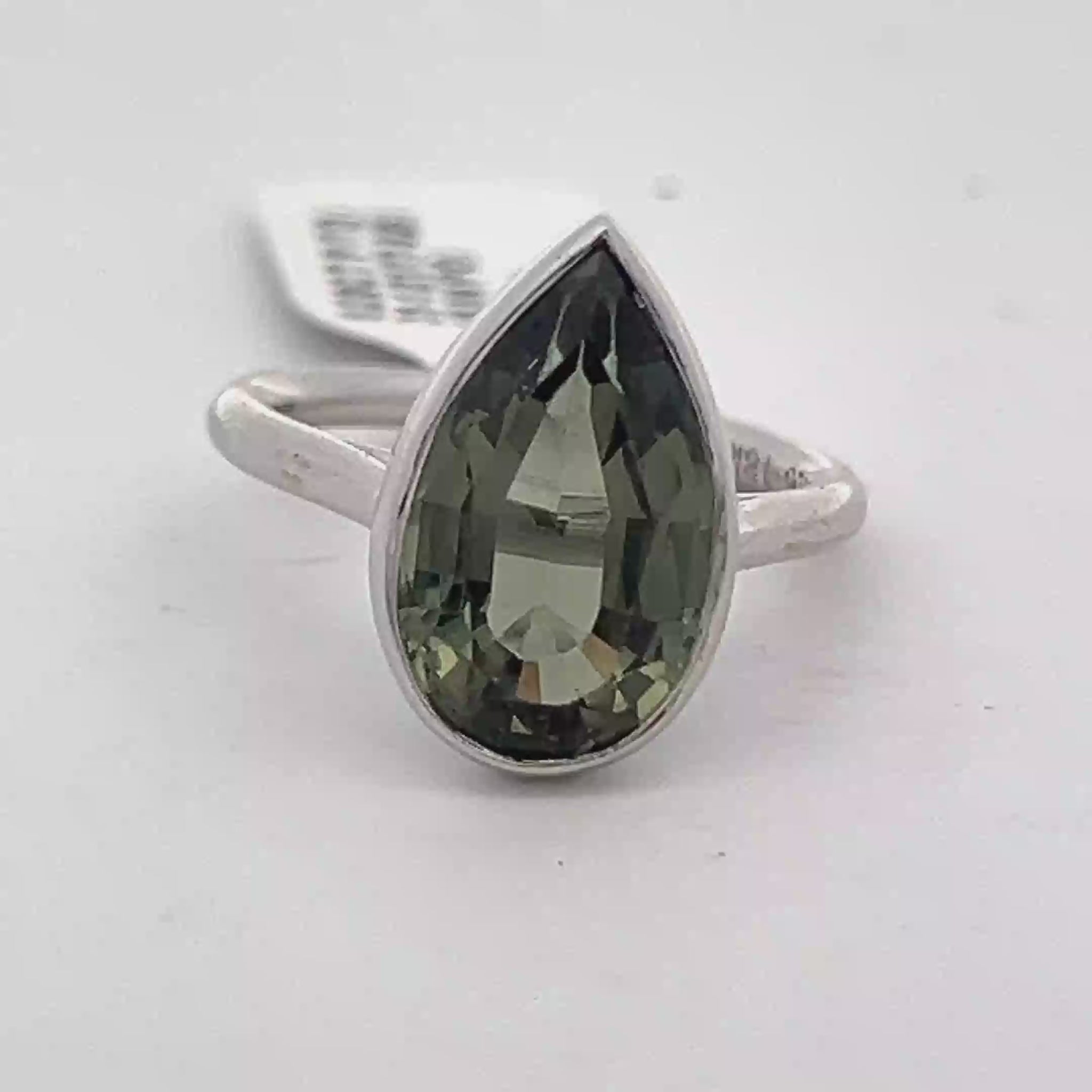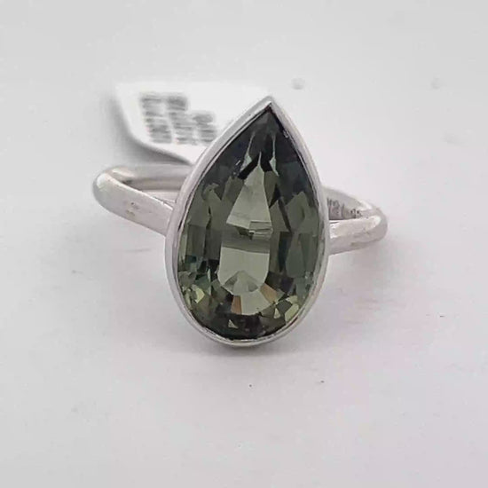Embrace minimalist elegance with this solitaire ring, showcasing a pear shaped tourmaline in a polished white gold setting. The gemstone's brilliant cut enhances its natural green tones, creating a captivating play of light. A timeless piece perfect for adding a touch of understated sophistication to any ensemble.