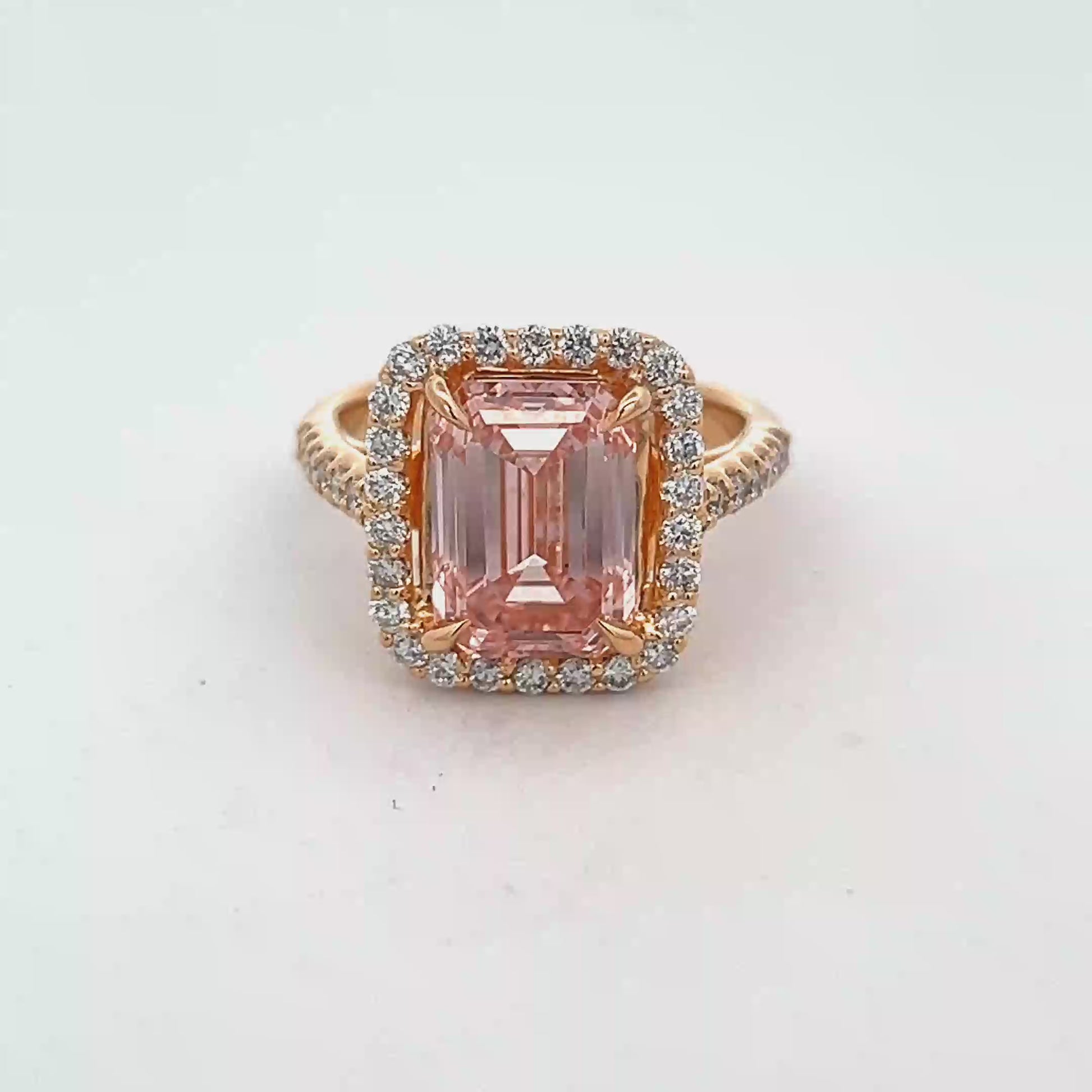 Indulge in the allure of this rose gold multistone ring, showcasing a mesmerizing fancy pink diamond. The emerald cut of the step-cut diamond exudes sophistication, while the surrounding stones add brilliance. A captivating design, this ring is a statement of refined elegance and impeccable taste.