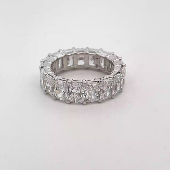 Indulge in the allure of this exquisite platinum eternity ring, crafted in lustrous white gold. Each emerald cut diamond is expertly set to showcase its remarkable brilliance. This radiant ring embodies everlasting beauty and sophistication, perfect for marking life's most cherished moments.