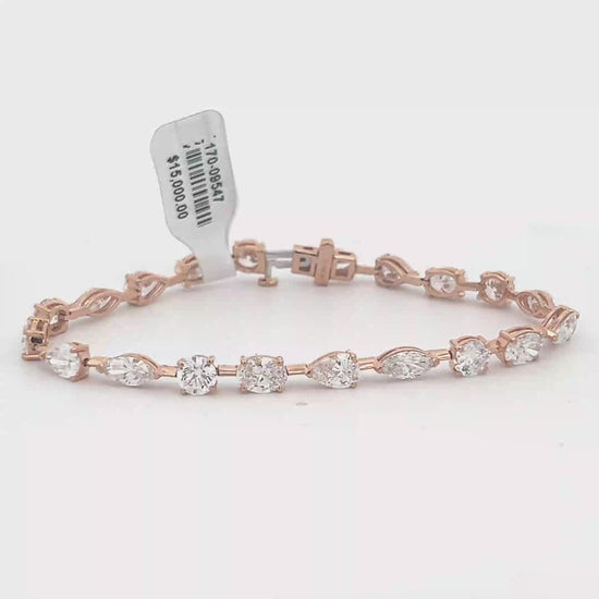 Indulge in the allure of this exquisite rose gold tennis bracelet. Featuring a sequence of brilliant-cut diamonds in varying shapes including pear, marquise and round, linked together with precision and care, this timeless design ensures an elegant drape on the wrist, making it an exceptional statement piece for any occasion. The clasp offers secure wear, completing this must-have accessory.