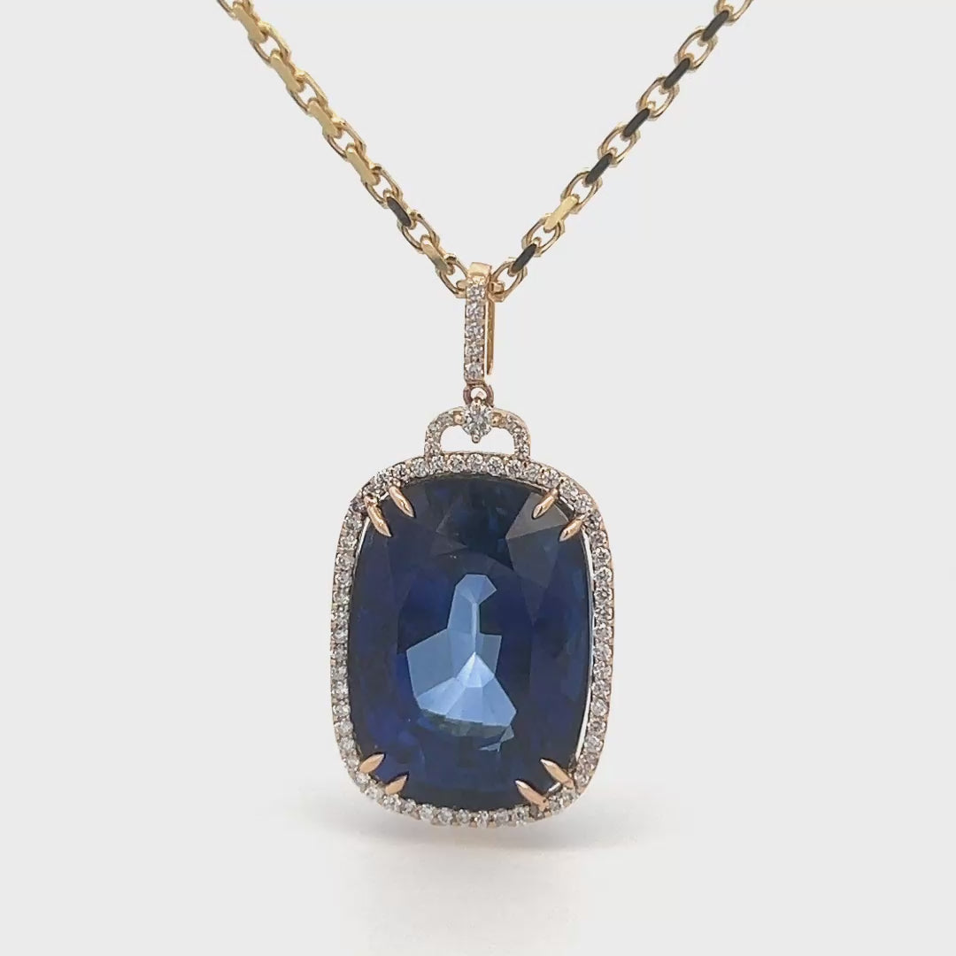 This exquisite pendant features a stunning blue gemstone, elegantly framed by a delicate gold chain. The deep blue hue of the gem is accentuated by the surrounding sparkling diamonds, making it an eye-catching piece perfect for any special occasion.