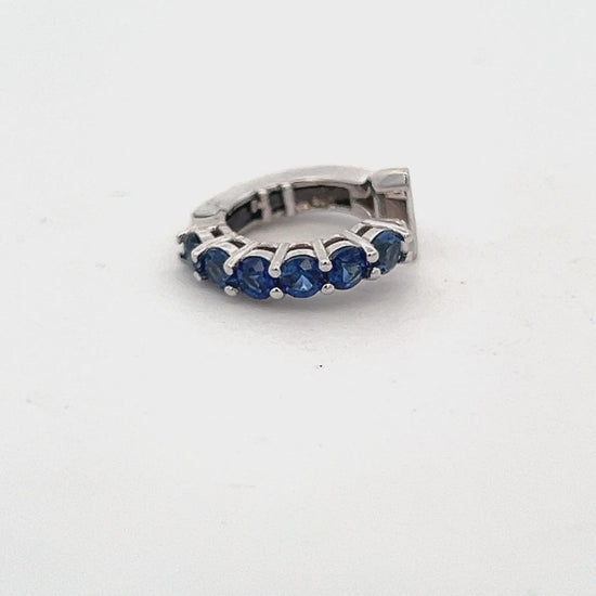 These elegant cuff earrings are crafted in lustrous 18K white gold, featuring a sophisticated channel-set arrangement of vibrant blue sapphires. Each round brilliant-cut sapphire displays exceptional color saturation and clarity, creating a continuous circle of royal blue brilliance. The high-polish finish enhances the sleek profile of the gold, while the secure hinged closure ensures a seamless and comfortable fit. A perfect fusion of classic geometry and gemstone luxury for refined everyday elegance.