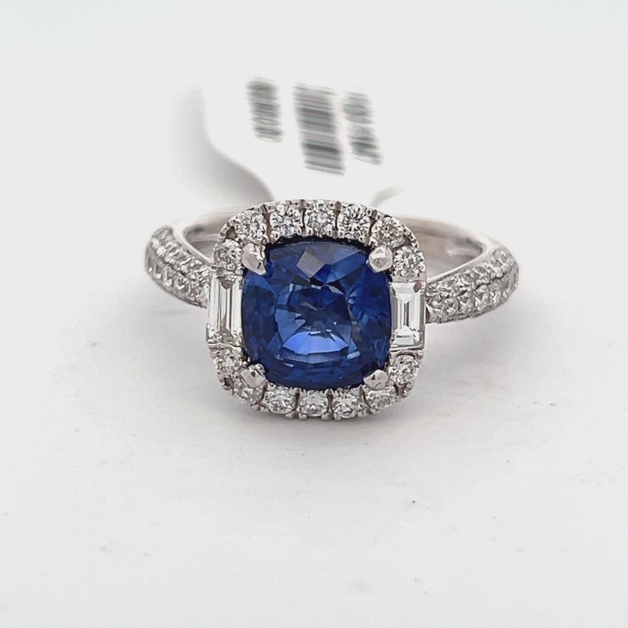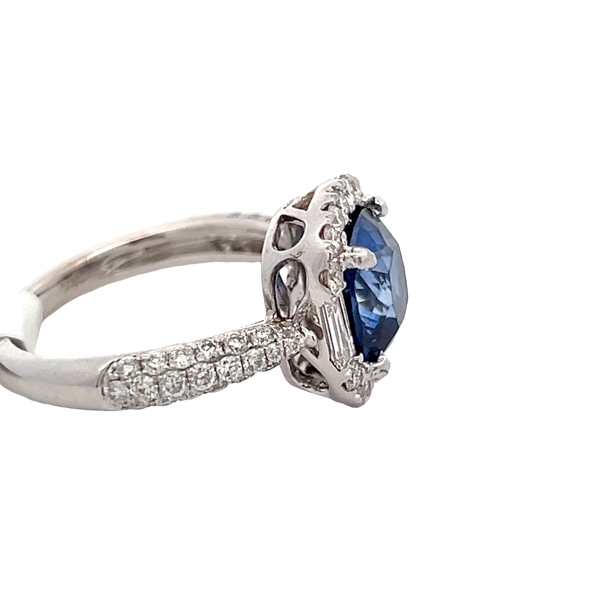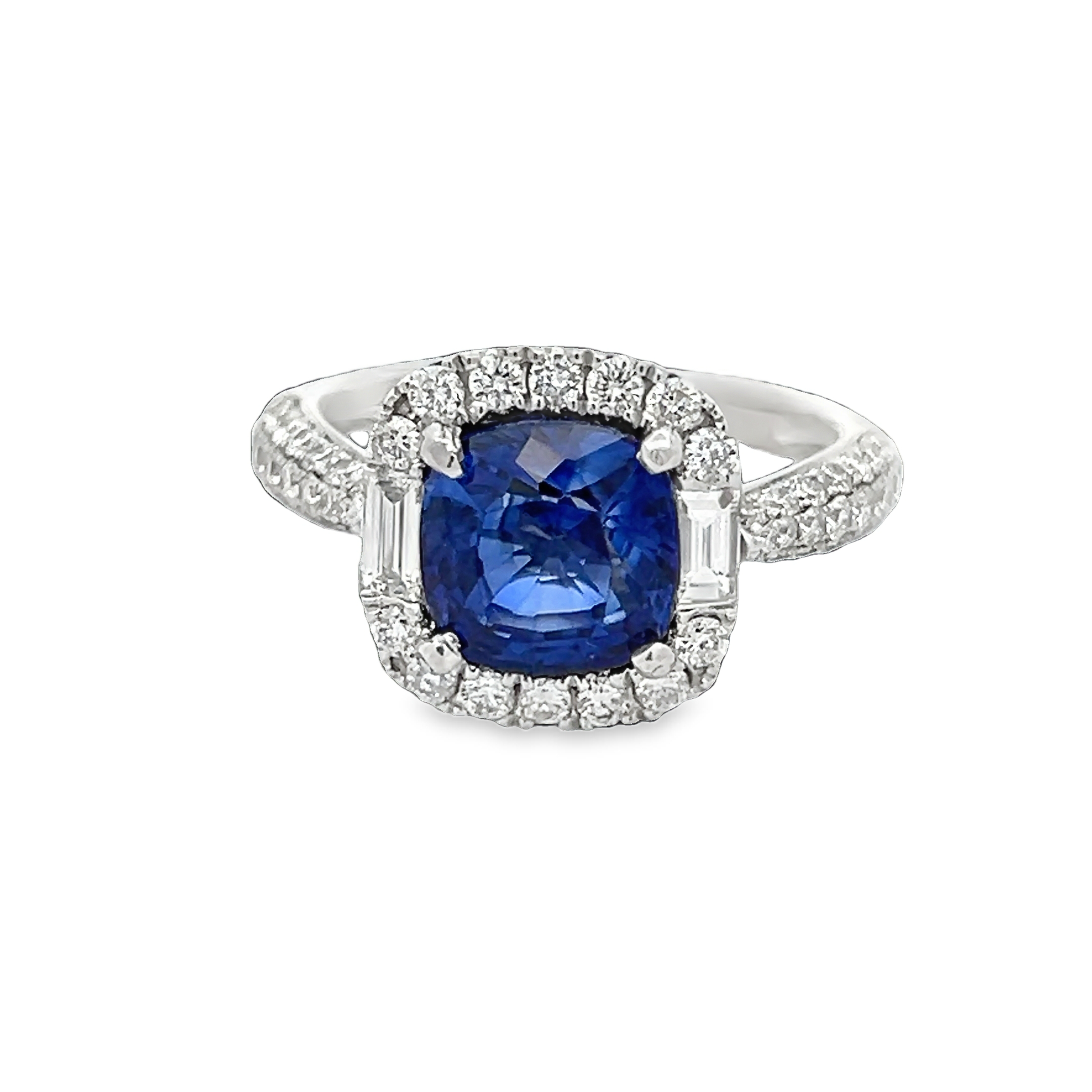 Lady's White 18 Karat Diamond And Lab Grown Sapphire Fashion Ring 2 = 0.22TWT Baguette Diamonds, 14 = 0.30TWT Round Diamonds, one = 2.88CT Cushion Sapphire (4.5gr)