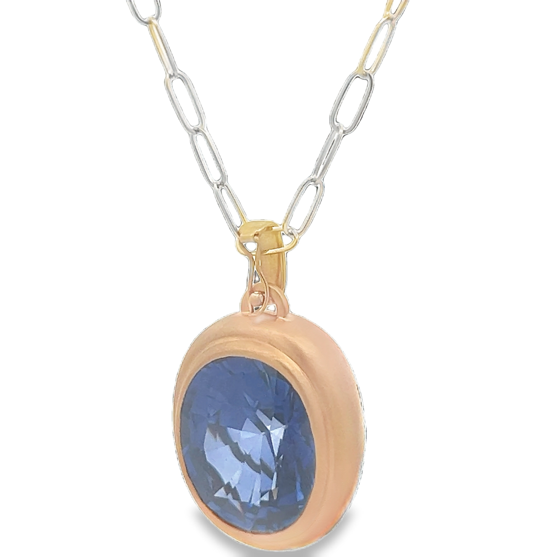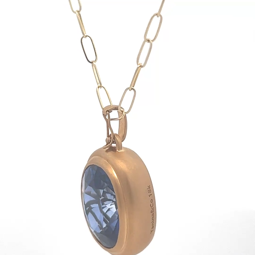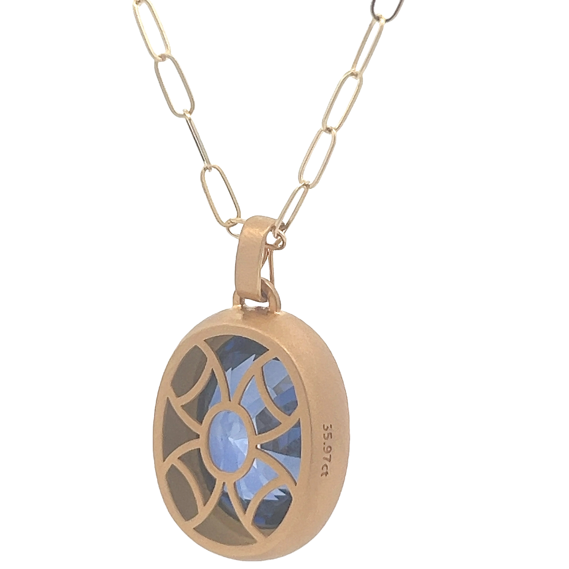 Lady's Yellow 18 Karat Bezeled Lab Grown satin finished Sapphire Pendants With One 35.97Ct Oval Compound Sapphire (17.7gr)