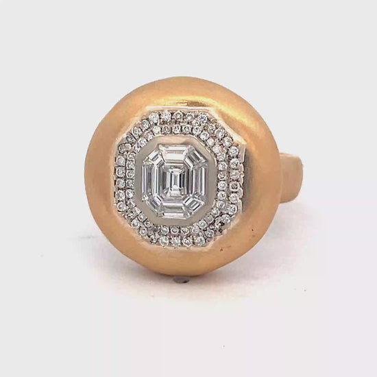 Exude sophistication with this bold cocktail ring, showcasing an emerald-cut diamond at its heart. This dazzling step-cut diamond is gracefully set within a textured yellow gold band, enhancing its inherent brilliance. The ring's exquisite craftsmanship and unique design make it a must-have piece for those who appreciate refined elegance and distinctive style.