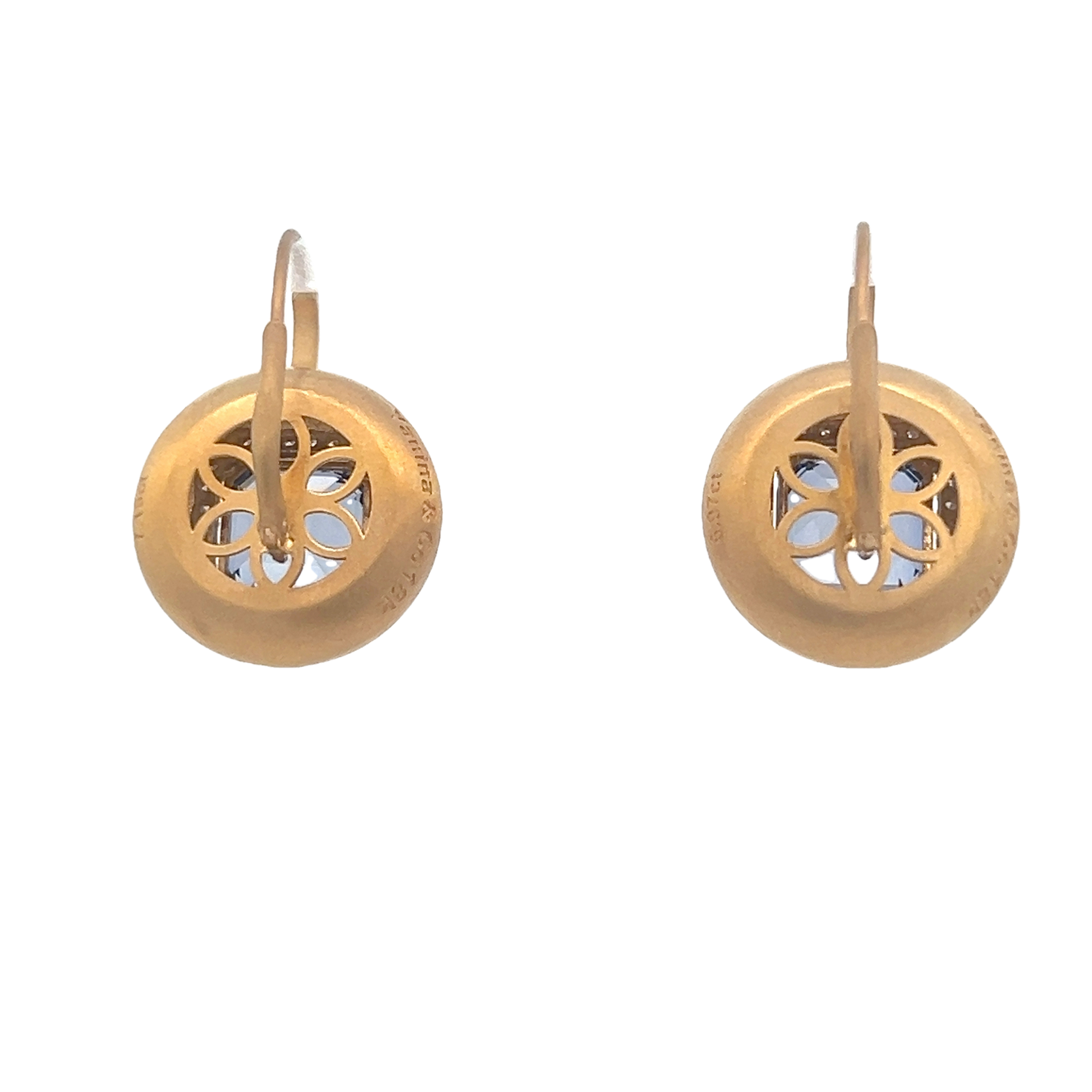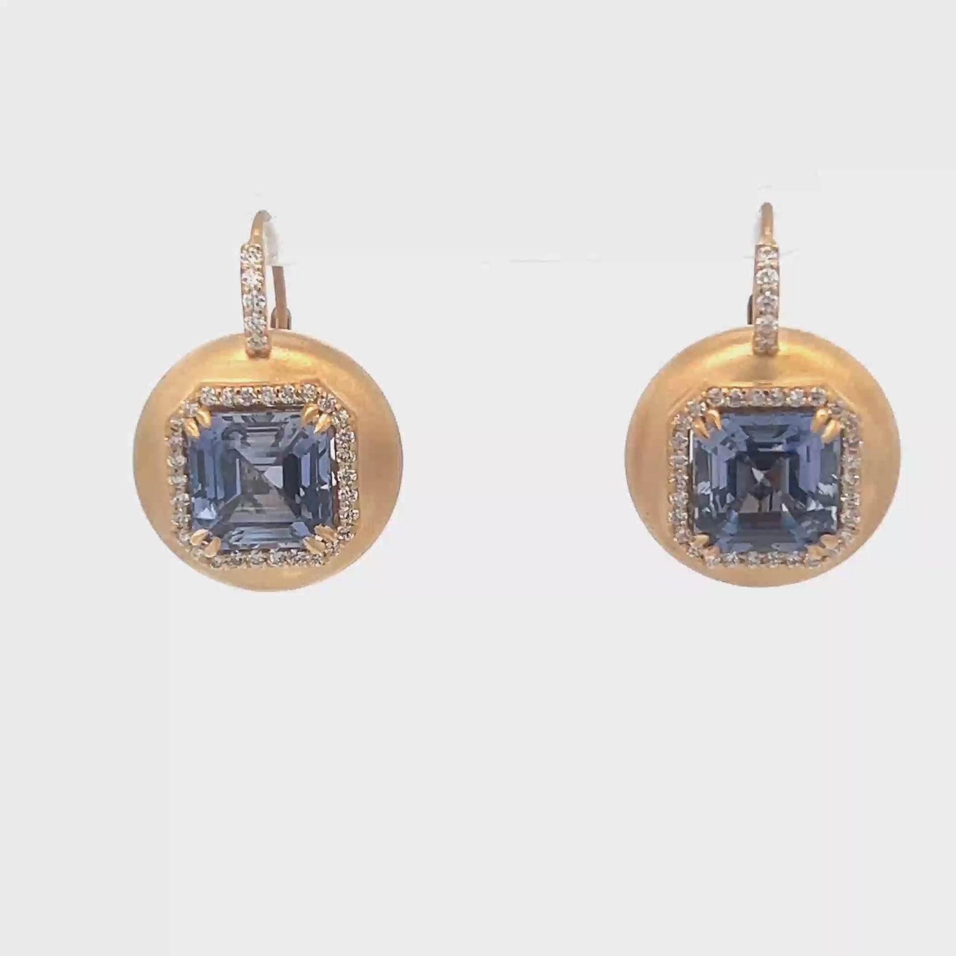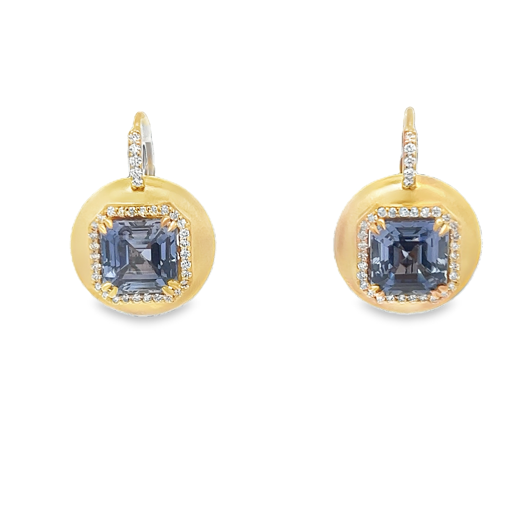 Lady's Yellow 18 Karat Satin Bubble With Halo Earrings With 74=0.80Tw Round Diamonds And 2=14.12Tw Assher cut compound sapphire (19.1gr)