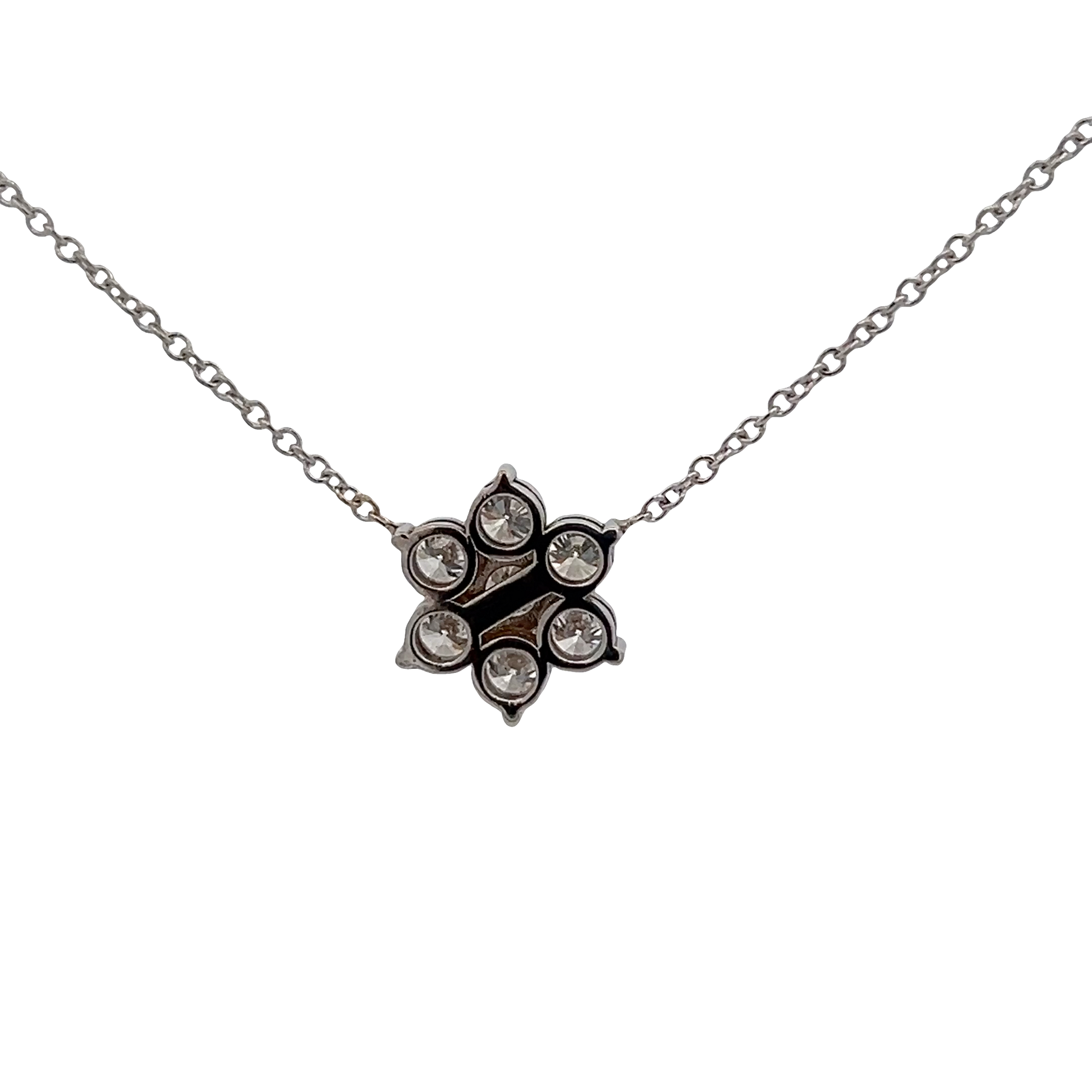 Elevate your style with this exquisite diamond flower pendant necklace. Crafted in lustrous white gold over silver, the pendant showcases a cluster of round cut diamonds set in a delicate floral design. A timeless piece that adds a touch of elegance and sparkle to any occasion.