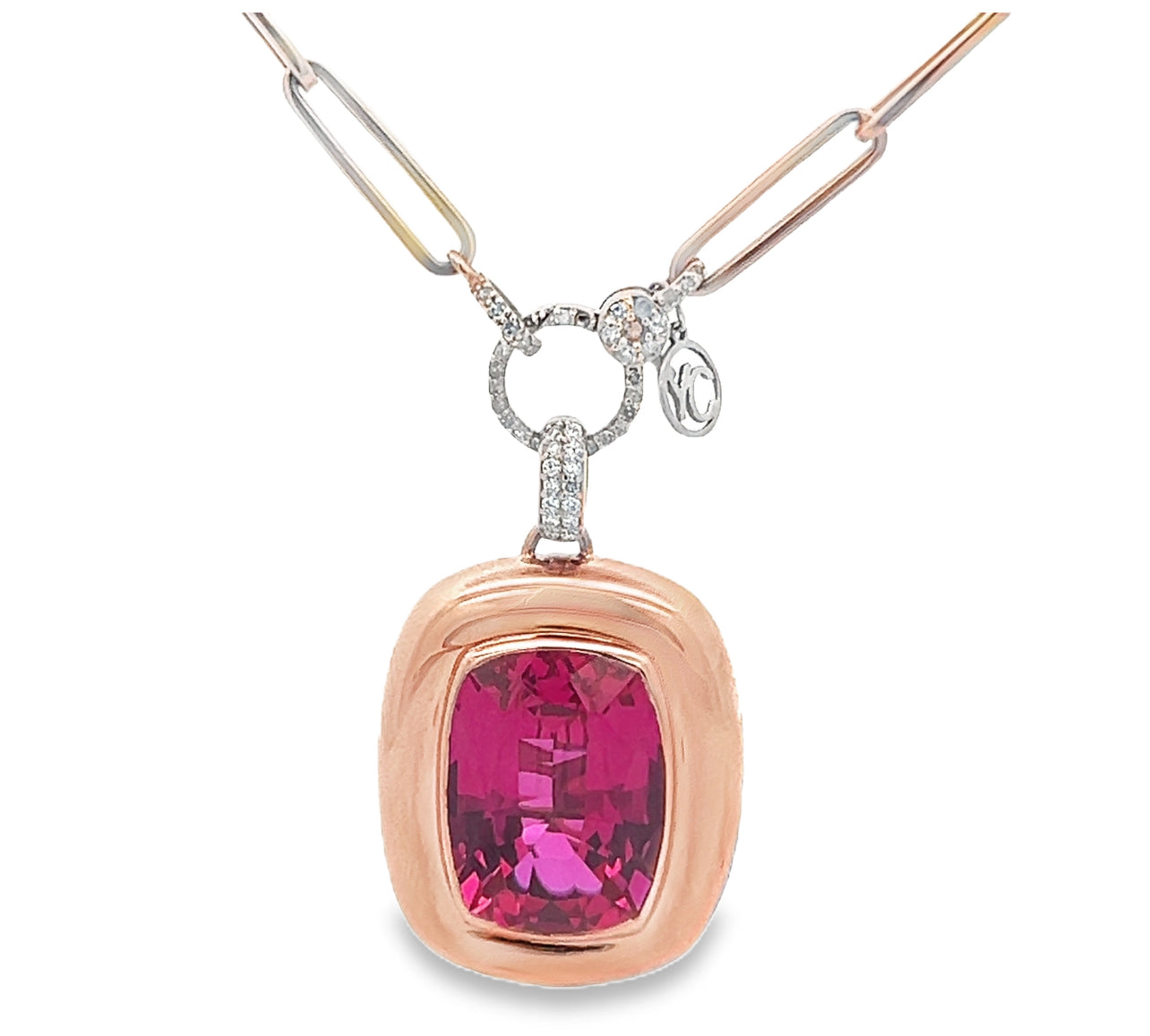Lady's Rose 14 Karat Bezeled Compound Pink Tourmaline Pendant With One 18.46Ct Cushion Tourmaline And 12=0.10Tw Round Diamonds (12.2gr)