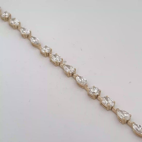 Elegant tennis bracelet featuring a sequence of brilliant-cut pear-shaped diamonds set in a sleek yellow gold. This bracelet embodies timeless sophistication and refined beauty, perfect for adding a touch of sparkle to any occasion. Its meticulously crafted design ensures a comfortable fit and secure wear.