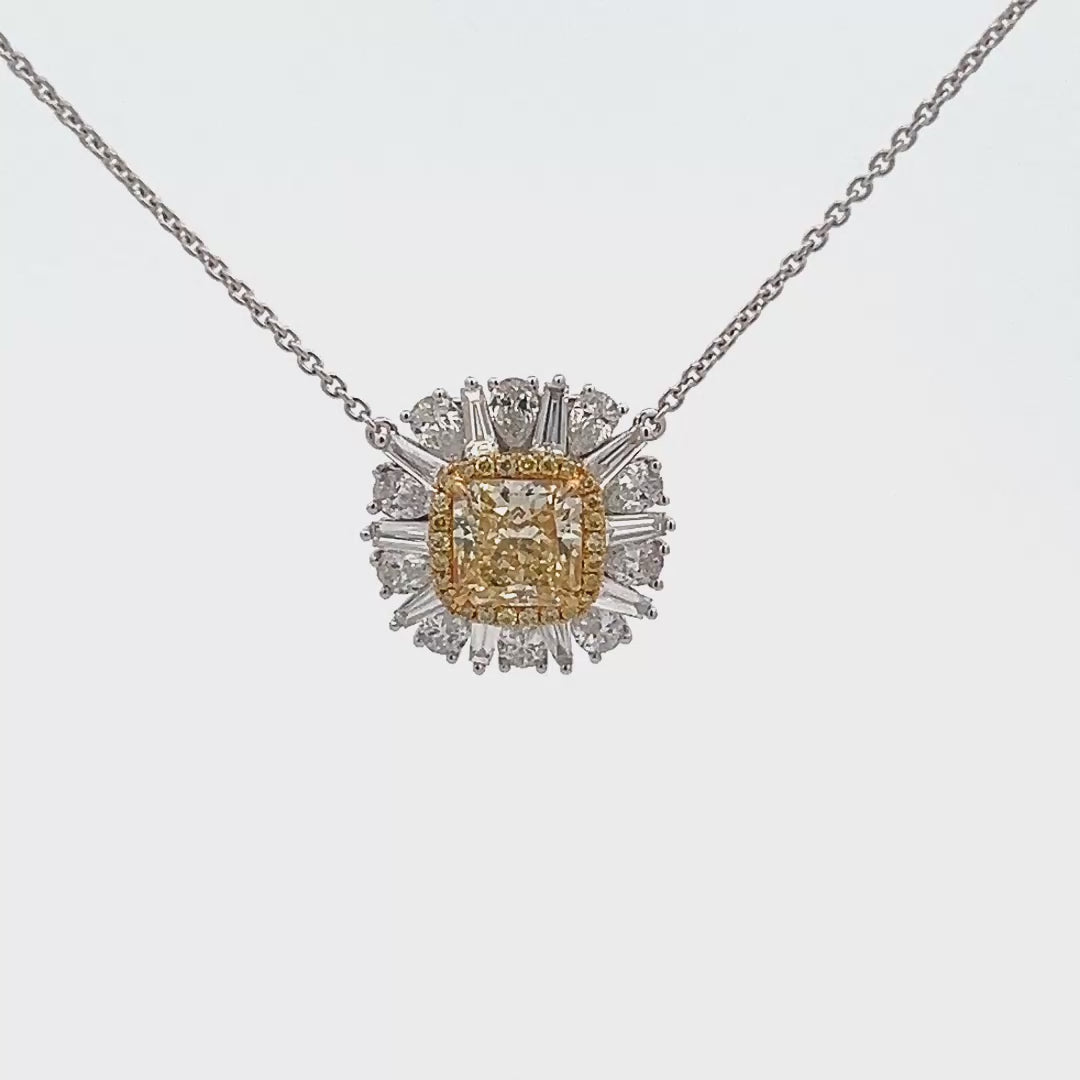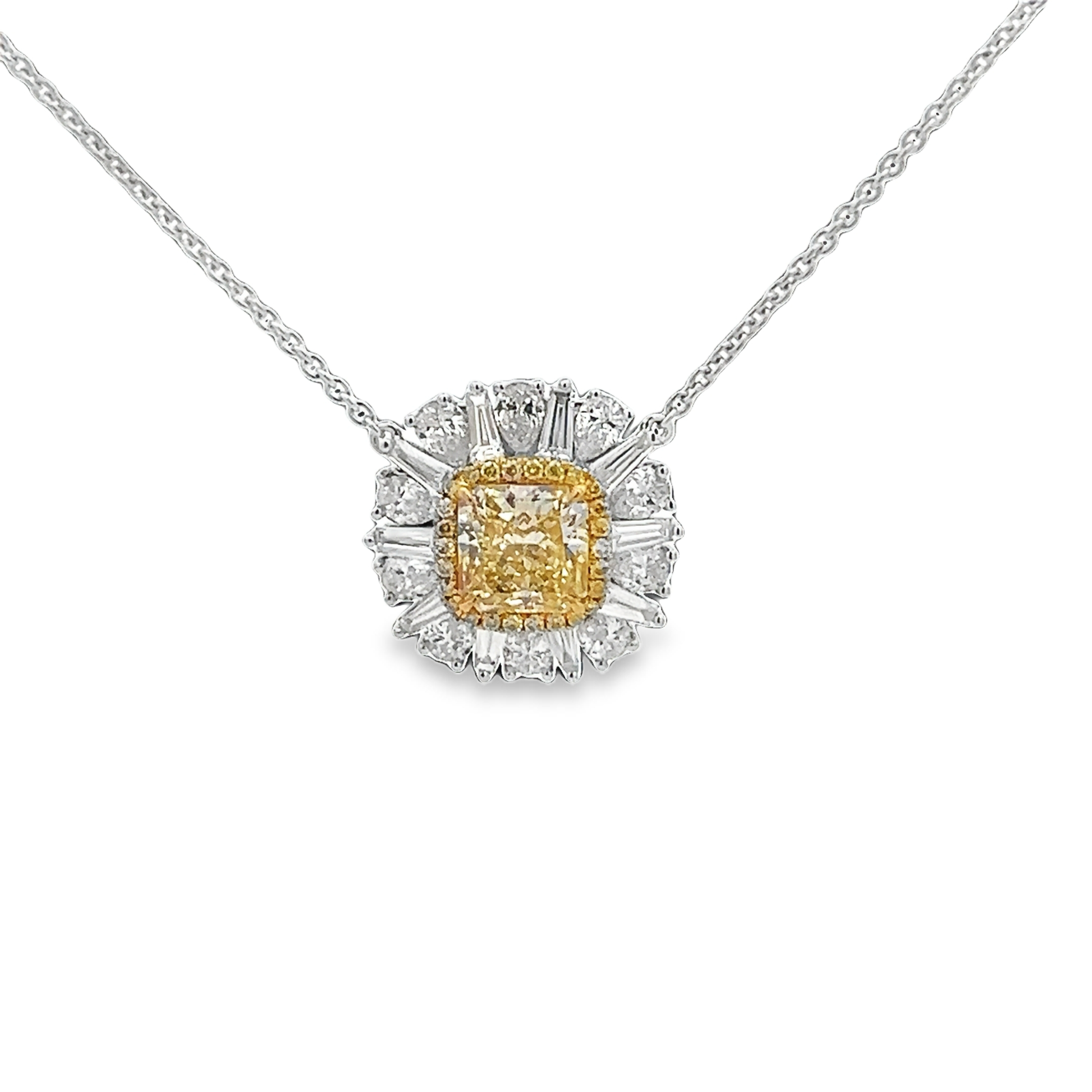Lady's White 18 Karat White And Yellow Diamond Cushion Shape Necklace Length 16'' with one 1.18ct Cushion Yellow Diamond 10=0.37Tw tapered baguette diamonds, 10=0.65tw Pear Diamonds, 24=0.08tw round yellow diamonds (5gr)