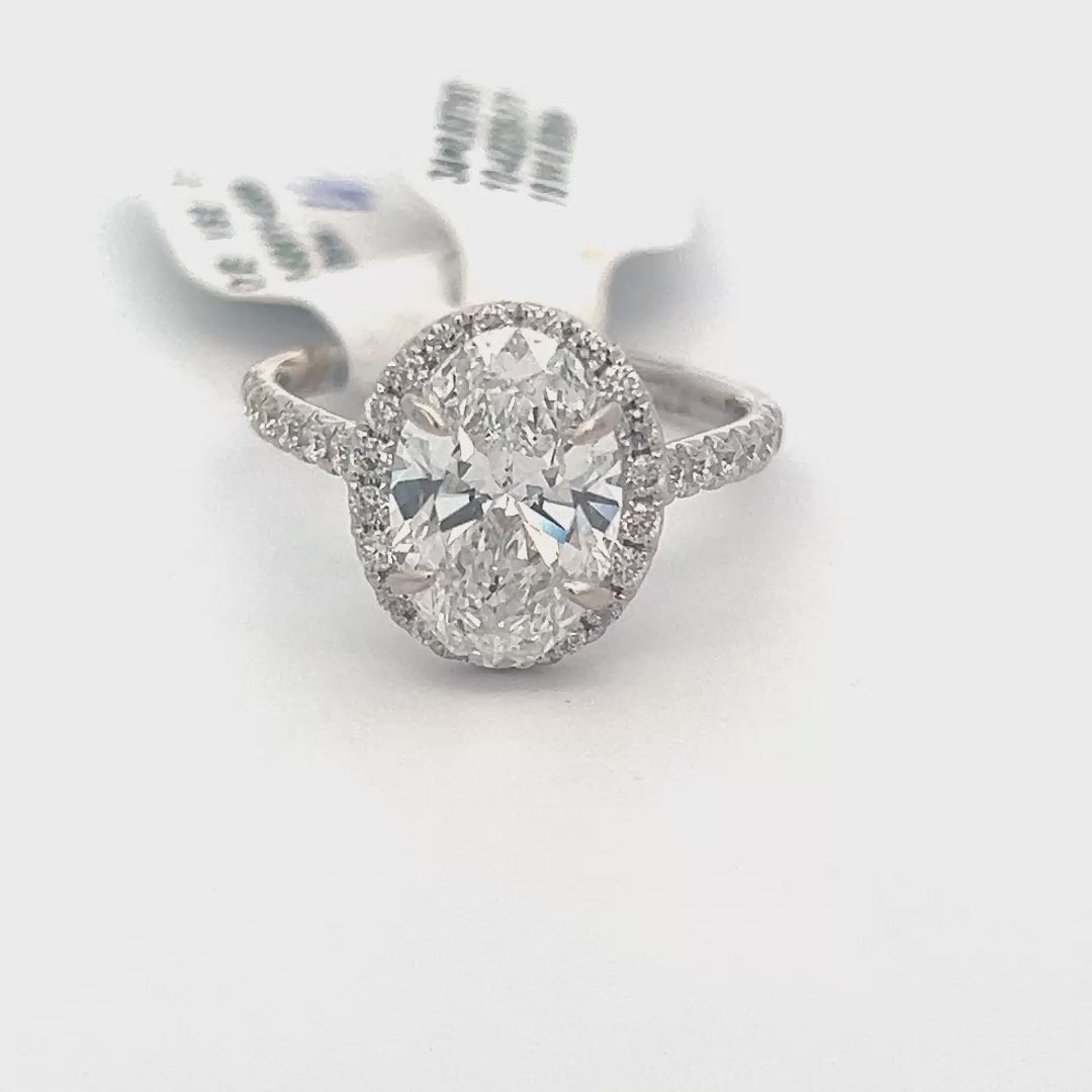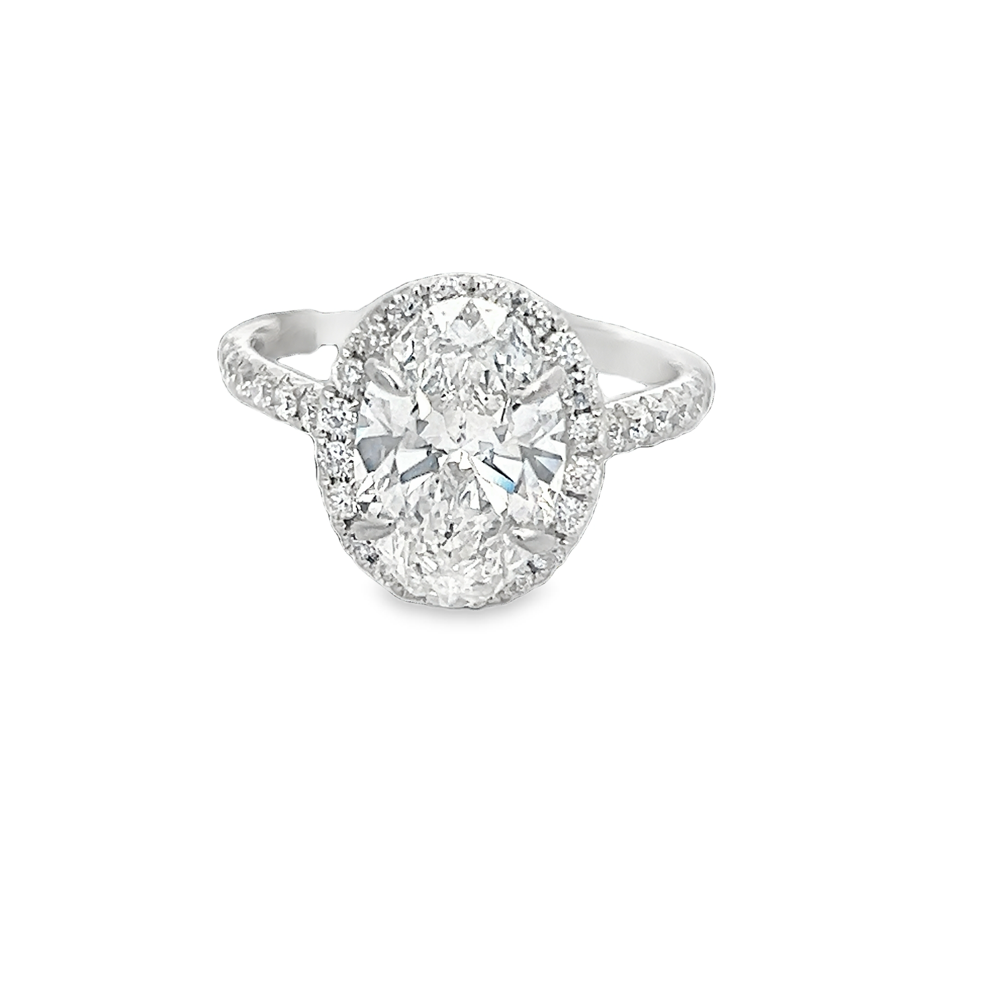This stunning oval diamond engagement ring features a brilliant centerpiece surrounded by a halo of smaller diamonds, creating a captivating sparkle. Crafted with precision, the band is designed for comfort and elegance, making it the perfect symbol of love and commitment.