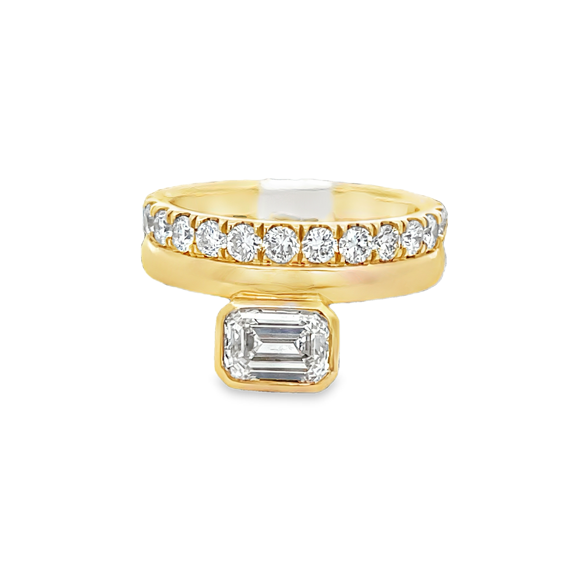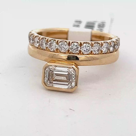 This sophisticated stackable ring features an emerald-cut diamond, renowned for its clean lines and step-cut facets that highlight exceptional clarity. The diamond is set horizontally in a minimalist yellow gold band, offering a modern aesthetic. Expertly polished with excellent symmetry, the gold's rich hue complements the diamond's brilliance. This piece is designed for versatile layering or as a refined standalone accessory, embodying timeless elegance through high-quality materials and craftsmanship.