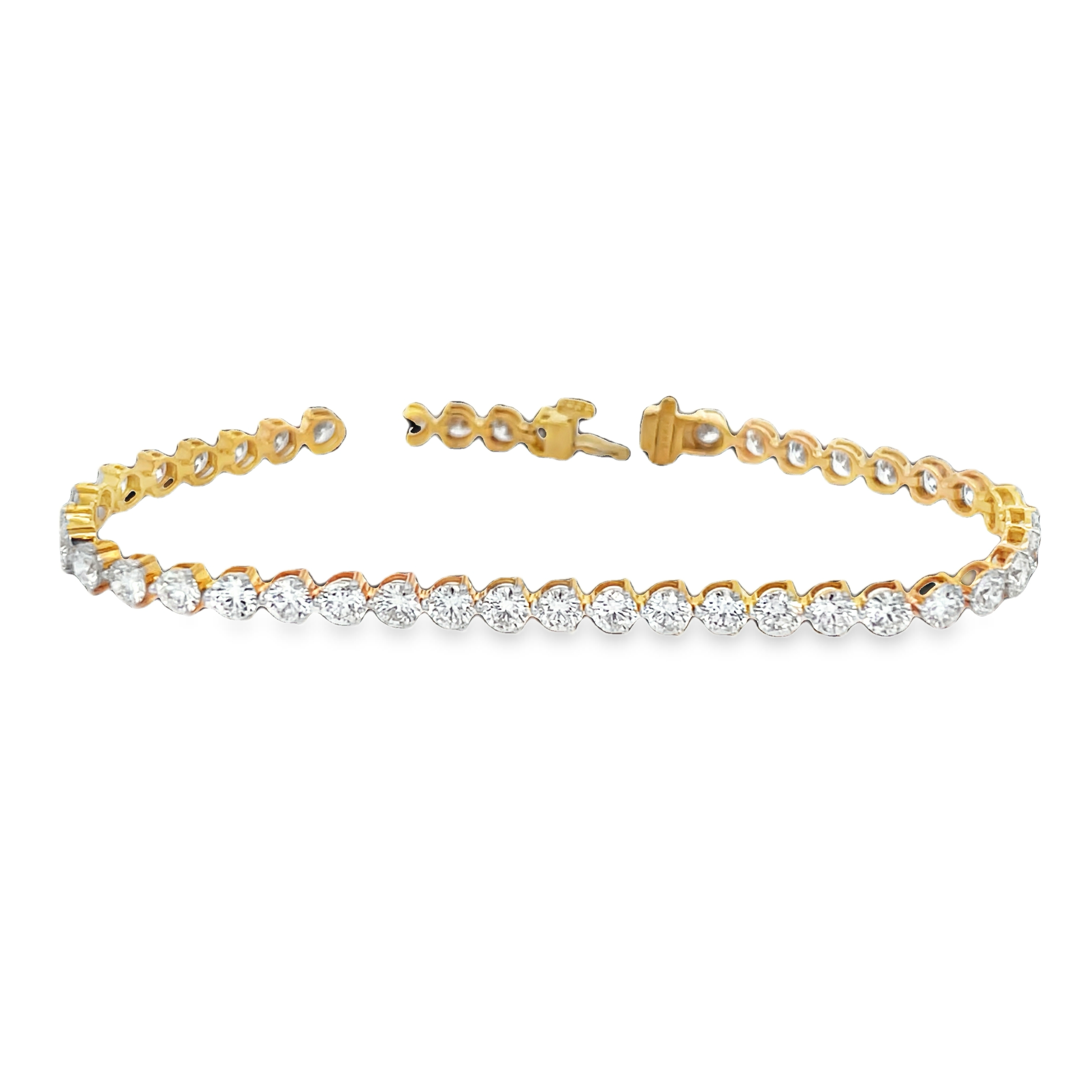 Elevate your style with this timeless yellow gold tennis bracelet. Featuring a seamless row of round brilliant cut diamonds, this bracelet exudes sophistication and grace. A classic design reimagined for the modern connoisseur, perfect for adding a touch of sparkle to any ensemble.